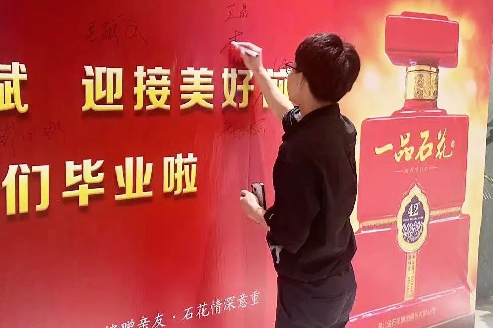 湖北石花酒业营销管理总部武汉大区见习总监陈伟上台致辞。首先他恭喜同学们毕业快乐,也愿各位前程似锦。他表示,153年来,湖北石花酒业秉承“匠心酿好酒、诚心待客户、爱心献社会、恒心促发展”的企业精神与企业追求,坚持“五心级”传统酿造工艺与标准,用心酿造每一瓶好酒,将“匠心”融入到每一滴石花酒中。他坚信,有了大家的鼎力支持,一定会开创湖北石花酒业更美好的未来。