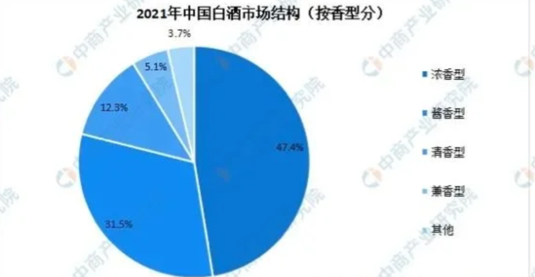 依据相关数据,2021年我国浓香型白酒占比达47.4%,酱香型白酒占比达31.5%,清香型白酒占比达12.3%,其次为兼香型及其他占比分别为5.1%、3.7%。2021年中国酱香型白酒销售收入达到1900亿元,同比增长22.60%,约占我国白酒行业销售收入的31.5%。酱香型品类快速完成了从成长期进入成熟期的转换。