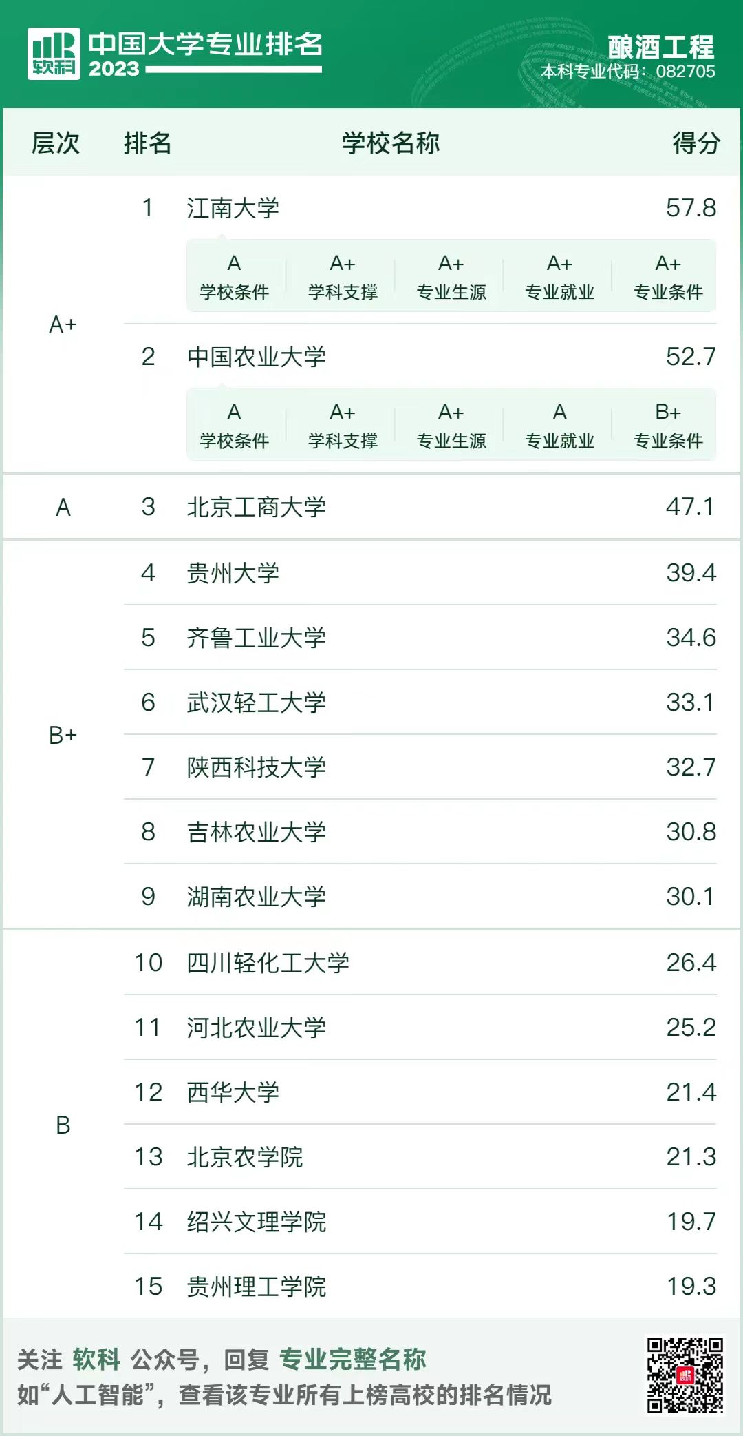 针对酿酒工程专业相关院校的排名,网络相关教育机构进行了评估。榜单显示,江南大学的酿酒工程学科评估等级为A+,位居第一。除了榜单上的大学,由中国贵州茅台酒厂(集团)有限责任公司出资兴办的茅台学院在业内也非常出名,其酿酒工程的毕业生往往会进入贵州的酒企。