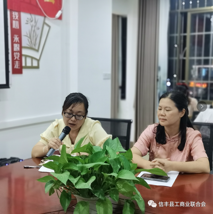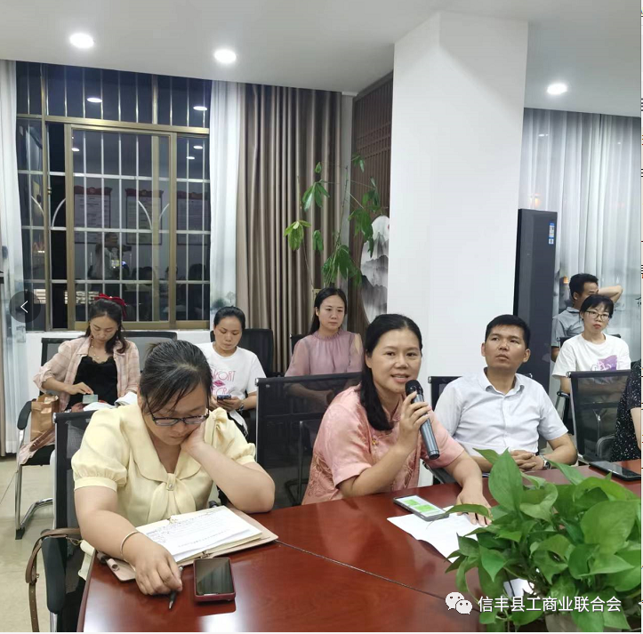 25日晚上,信丰县女企业家商(协)会在商会二楼会议室召开信丰首届商会企业产品展销会总结大会,出席总结大会的领导及嘉宾主要有县工商联党组成员、副主席肖萍,县建材装饰广告行业商会会长邱伟强,县返乡就业创业联合商会执行会长、信丰县诚信建材联盟负责人钟勇,县女企业家商(协)会会长陈瑞兰,县五金制品行业商会副会长钟有翔、秘书长刘建平。