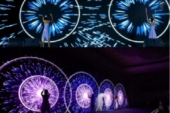 时尚动感、耀眼夺目的3D炫鼓互动秀《鼓动未来》。以传统中国元素为索引,将凝聚、升腾、延伸的概念巧妙融入其中。舞者模拟击鼓动作,活动主题以声波形式跟随击鼓节奏动感释放发出激扬、雄浑的鼓声,传达登州路未来续写辉煌的昂扬斗志和坚定信心。特效背景与舞者仿真交互的极致运用,则增添了整场表演的科技创新感。