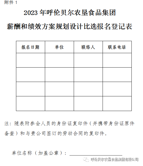 因食品集团及所属企业改革发展需要,针对原《薪酬和考核系列制度》对食品集团总部及所属二级单位薪酬绩效系列制度进行改革优化和提升,在薪酬绩效上探索新的管理模式进行创新改革,制定符合食品集团实际的薪酬绩效考核等系列管理办法,包括食品集团工资总额管理办法、领导班子薪酬管理办法、食品集团及所属二级单位薪酬绩效考核管理办法、营销团队薪酬与绩效管理办法、营销项目运营管理办法、职业经理人管理办法等内容。聘请第三方专业团队深入食品集团进行实地调研,结合食品集团实际情况,设计符合食品集团实际,匹配食品集团高质量发展的系列方案。现将比选有关事项公告如下:(一)项目名称:呼伦贝尔农垦食品集团有限公司薪酬绩效等系列制度改革规划设计项目(一)服务内容:结合食品集团实际情况,设计符合食品集团实际,匹配食品集团改革高质量发展的系列方案,制定食品集团工资总额管理办法、领导班子薪酬管理办法、食品集团及所属二级单位薪酬绩效考核管理办法、营销团队薪酬与绩效管理办法、营销项目运营管理办法、职业经理人管理办法等内容。(一)在中华人民共和国境内注册,具有独立法人资格,有独立承担民事责任的能力。(二)具有项目咨询和设计范围,同时具有项目设计资质。(三)具有履行合同所必需的专业人员和专业技术能力,以及项目相关业绩。(四)具有良好的企业信誉和健全的财务会计制度,有依法缴纳税收和社会保障资金的良好记录。(五)近3年内,比选申请人(法定代表人)在经营活动中没有重大违法记录,未被列入全国信用信息共享平台失信联合惩戒对象“黑名单”;法定代表人、经济或技术负责人没有因违反有关规定受到行政处分或刑事处罚。(一)营业执照。营业执照、开户行许可证(或基本存款账户信息)等复印件,复印件需加盖公章。(二)业绩证明。近三年(2020年-2022年)相关业绩证明材料(复印件或扫描件)。(三)身份证明材料。比选单位法定代表人亲自参加的,提供法定代表人身份证复印件,如委托其他人参加的,需提供受托人身份证复印件。一是出具对往年在经营活动中没有重大违法记录,未被列入全国信用信息共享平台失信联合惩戒对象“黑名单”的承诺书;二是出具对法定代表人、经济或技术负责人没有因违反有关规定受到行政处分或刑事处罚方面的承诺书。三是在与我公司建立委托服务期间,因比选申请人原因,造成的一切损失,由比选申请人承担全部责任的声明。(六)服务价格。比选申请人的报价以最高限价为基础,进行浮动报价,不得超过最高限价。凡有意参与者,可将报名材料送至食品集团党群工作部或发送至指定邮箱529137854@qq.com。(一)从报名的符合条件单位中,由我公司发布邀请函。(二)比选单位持邀请函、比选报名登记表(见附件一)和相关材料于指定的时间和地点参加比选(邀请函需加盖公章)。如因特殊原因,比选单位不能参加现场比选评审会的,可以通过视频的形式参加。(三)呼伦贝尔农垦食品集团有限公司评审组经过比选评分后,评分最高的单位拟确定为中选单位。(四)签订委托合同。合同签订后,设计单位应积极履职,按照合同的要求,依法依规按照项目内容开展相应的工作,不得在服务过程中出现损害呼伦贝尔农垦集团有限公司的行为及法律法规明令禁止的行为。如有违反上述要求的单位,一经发现立即将其列入公司“黑名单”。八、本次比选的最终解释权归呼伦贝尔农垦食品集团有限公司所有。