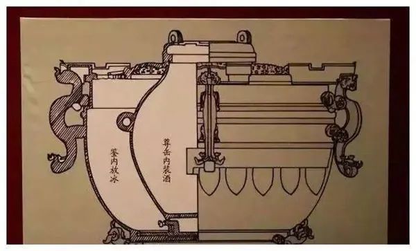 曾侯乙墓出土的铜鉴缶、尊缶、尊盘等代表器物为楚人、曾人好“冻饮”提供了实物证明。三种器物功用相似,其中青铜鉴缶设计奇巧,铸造复杂精工。主要由鉴体、鉴盖、方尊缶、缶盖四部分套合而成。方尊缶是盛酒的器具,将两者结合在一起,是为了用来冰酒或热酒。夏天放置冰块于鉴中可使酒降温,冬天可加入热水或置入木炭燃烧以加热。因此夏天就可喝到冰镇美酒,冬天可以喝到温热的甘醇。