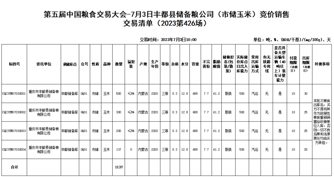 受重庆市丰都县储备粮有限公司委托,重庆市粮油批发市场有限责任公司(即国家粮食重庆交易中心,以下简称“批发市场”)定于2023年7月3日10:00举办丰都县储备粮公司(市储玉米)竞价销售交易会,现将有关事项公告如下: