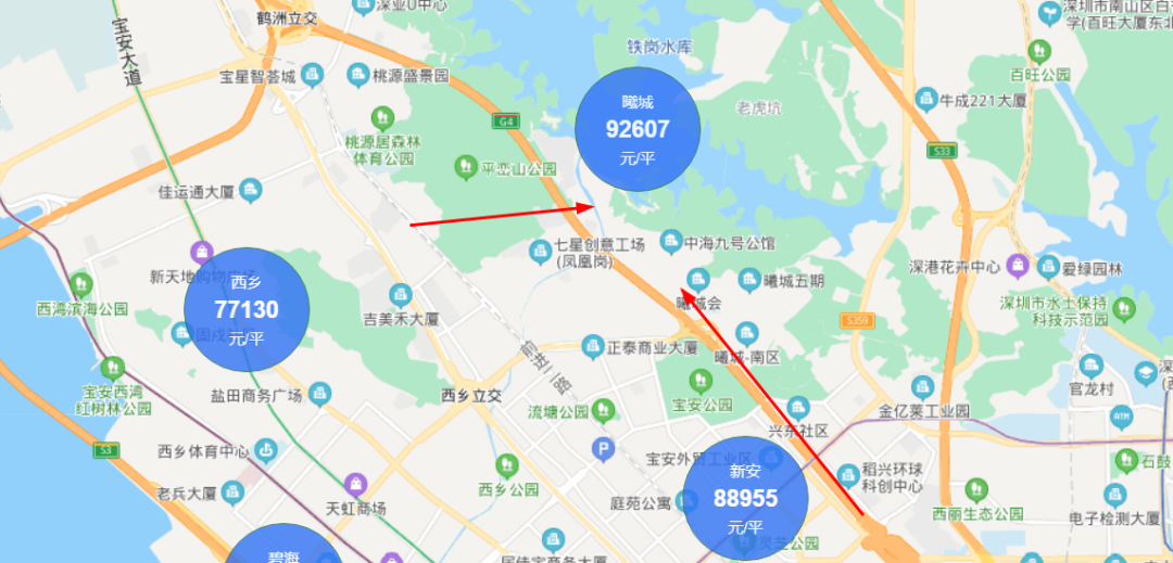 按照贝壳的数据显示,兴东片区临近的曦城片区房价高达92607元/平,远高于宝安8.1万的区域楼价,而新安区域的总体均价为88955元/平。