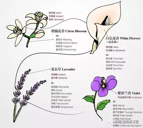 3. 柑橘花香:主要来源于橙花醇、芳樟醇、香茅醇等化合物,这种香气非常复杂,是白葡萄酒中理想的香气。以下葡萄酒中会含有柑橘类花的香气:雷司令、白诗南、维欧尼、霞多丽等。
