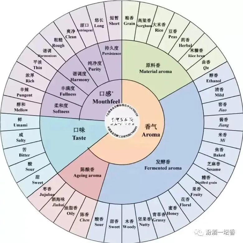 现在情况变了,为规范白酒的品鉴,国家于2016年颁布了国标GB/T33405-2016“白酒感官品评术语”,从此有了中国白酒的“风味轮”。