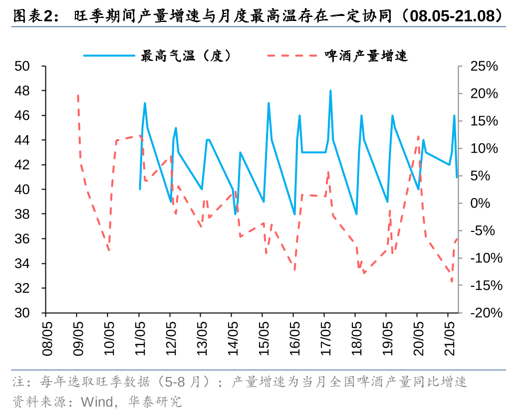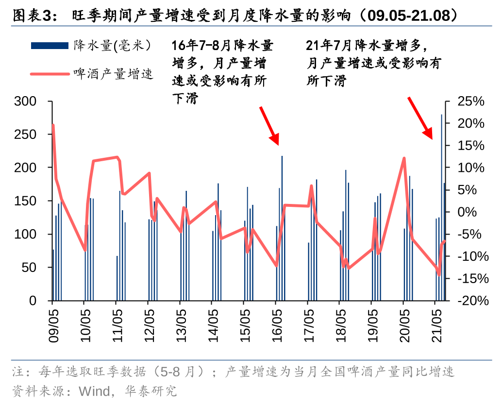分月度看:高温为影响旺季动销主要因素,关注降雨等不确定因素的影响。2008-2021年,啤酒消费旺季(5-8月)期间的产量增速与月度最高温变化间拟合度较高,表明高温对于啤酒旺季消费的拉动存在一定促进作用。而降水量过高则存在负面影响,如16/21年7月降雨量高达218/280毫米,对应当年旺季期间的啤酒产量增速处于相对低点,部分原因为受到异常强降雨量的影响。