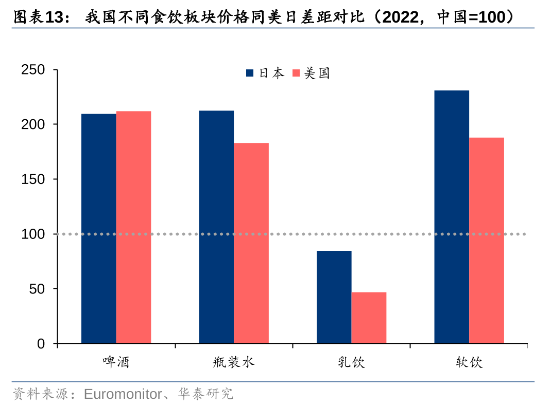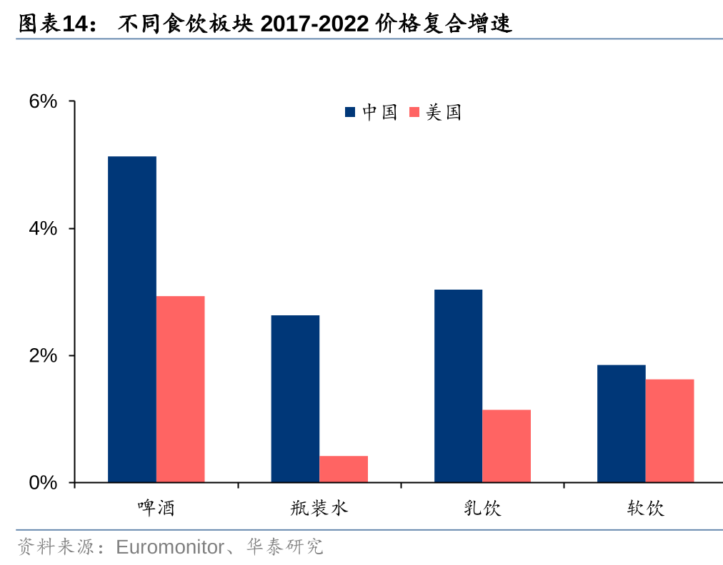 长期看,对标海外啤酒价格仍有翻倍空间,且增长仍具显著持续性。以美国成熟啤酒市场的价格作对标,啤酒相较其他食饮品类涨价空间更大,22年美国啤酒/软饮/瓶装水/牛奶零售均价分别是中国的2.1/1.9/1.8/0.5倍,牛奶消费价格超过美国,侧面印证我国居民在食品饮料领域已具备较高的消费能力,而啤酒由于早期“价格战”激烈导致产品价格仍处于较低水平,若以美国为对标,未来仍有翻倍的上升空间。纵向看,啤酒价格增长更具可持续性,美国软饮/瓶装水/牛奶价格17-22年CAGR为1.6%/0.4%/1.1%,而啤酒CAGR为2.9%,成熟市场中啤酒价格亦呈稳健增长的态势,牛奶、瓶装水的高端化以品质化为焦点,产品异质性较弱,渠道商(如大型商超等)可提供品牌背书而价格更弱,啤酒高端化则伴随着持续的产品创新/品牌内涵丰富,厂商可持续获得溢价。