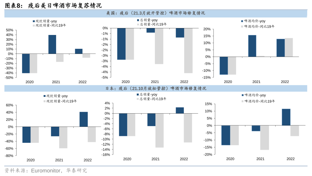 从啤酒消费的表现来看:消费力与消费场景的共同支撑下,美国啤酒ASP突破疫前水平,日本仍在修复进程中。销量端,疫情期间的管控政策冲击现饮端啤酒消费,美国20年现饮消费量同比-40.5%,疫后(21年3月管控放松后)两年在消费力与消费场景高弹性修复的支撑下,现饮消费量于21/22年同比实现39.7%/10.6%的高弹性增长,修复至19年的83%/92%,拉动22年总销量修复至19年的96%;日本受餐饮复苏节奏影响,22年(21年10月管控放松后的1年内)现饮消费量同比+41%,但仅修复至19年的57%,总销量仅修复至19年的89%。价格端,餐饮/夜场等现饮场景是高档啤酒消费的核心场所,在消费力的支撑下,21-22年美国现饮回暖推动均价显著回升(同比+16%/+13%),均价较19年提升0.6%/13.5%;日本的现饮修复情况弱于美国,22年啤酒均价同比提升12%开启结构修复,但较19年仍下降7%,销量和结构均有进一步修复空间。