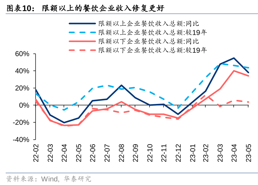 结构端,社交娱乐需求显著回补,夜场/连锁餐饮率先受益,驱动啤酒消费结构升级延续。1)夜场、聚餐等社交场所:疫情期间夜场闭店率高企(据重庆啤酒,22年夜店开店率仅60%+),亲友聚餐等消费场景受限,23年以来随防疫政策优化,社交娱乐场所经过重新开店(1-2月)—酒企入驻(3-4月),啤酒消费迎来弹性修复,并成为带动高档及超高档啤酒消费的核心驱动;2)大众餐饮:据Wind,23年以来,得益于更强的抗冲击与抗风险能力,限额以上餐饮企业承接了更多的疫后餐饮回补需求,其收入的修复弹性与超额回补均优于小型企业,下游结构性修复亦将更好带动啤酒消费的向上升级。从1-5月龙头酒企的核心大单品表现来看,现饮占比高且价位在12元及以上的产品实现了显著优于公司整体的销量增速,结构升级趋势兑现。