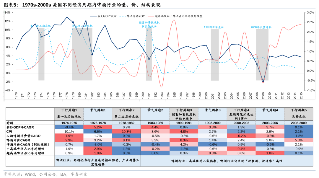 在二维框架下复盘美国1970s-2000s历次经济周期中啤酒行业的表现: