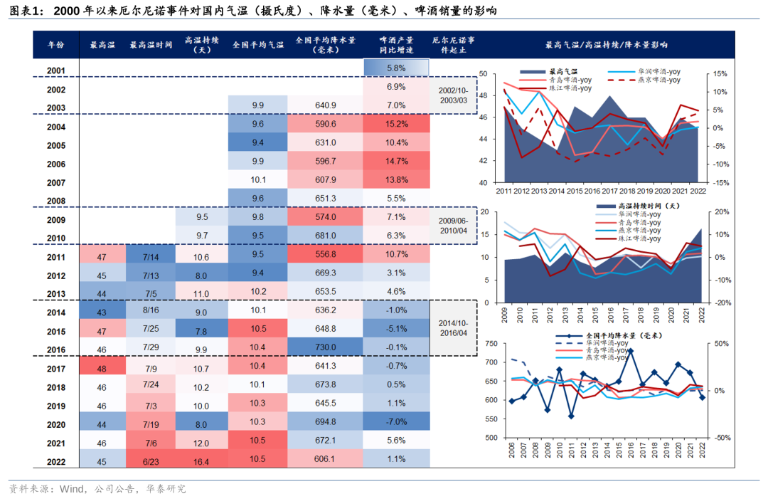 受益于厄尔尼诺气候,持续高温有望提振全年啤酒消费。5月3日,世界气象组织(WMO)提出长达三年的拉尼娜现象已经结束,并预测在7月至9月期间从厄尔尼诺-中性状态过渡到厄尔尼诺的可能性为80%;美国国家海洋和大气管理局(NOAA)亦指出,厄尔尼诺的到来基本已成定局。复盘来看,2000年以来共计发生3次厄尔尼诺事件(02-03年、09-10年、14-16年),其中14-16年为强厄尔尼诺事件。受温室效应影响,全球气候呈逐年升温趋势,但厄尔尼诺发生期间,全国平均气温及最高温仍有显著提升,且高温持续日数相对较多。整体来看,历次厄尔尼诺带来的高温气象对啤酒产销量有一定的促进作用,但期间亦需关注降雨量等不确定因素的扰动,如14-16年厄尔尼诺期间,啤酒销量下滑则为受到强降雨等极端天气增多、南方凉夏的影响,此外宏观经济增速放缓、啤酒行业高端化等因素亦对销量造成影响。