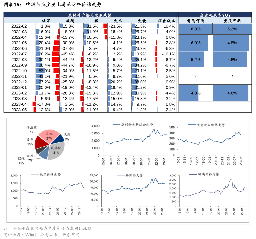 包材:铝材、纸箱等包材价格回落,利润弹性有望释放。23年以来,啤酒材料中占比较大的主要包材成本在前期大幅上涨后持续回落,铝/纸浆价格4月分别同比-11.2%/-17.3%,5月同比-11.9%/-12.6%,有效对冲大麦所带来的综合成本压力;玻璃受库存下降及地产政策预期升温影响,价格在22年低位的基础上同比有一定上涨。整体来看23年包材价格有望整体下行,将主导整体成本端压力逐季改善,加速释放盈利弹性。