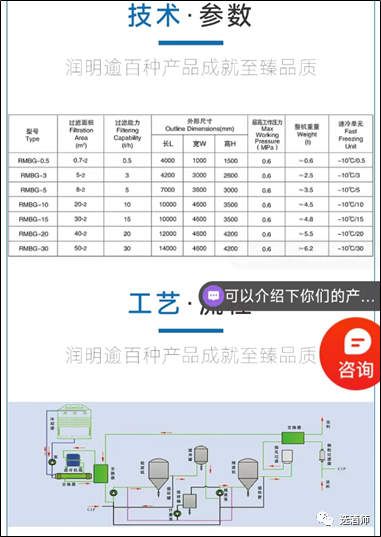 扬州润明智能装备股份有限公司部分产品的参数和工艺流程,表中最小型号机器的过滤能力在0.5吨每小时。