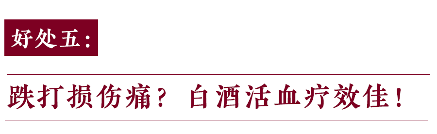 白酒具有舒筋通络、活血化淤的功效。这一功效早已在我国民间得到了普遍的应用。跌打损伤后,人们常习惯用白酒来按摩患处,能舒筋活血,消除疼痛。对于某些由于寒、湿所导致的关节疼痛患者,可以用白酒对关节进行揉搓,疗效甚佳。