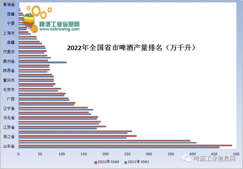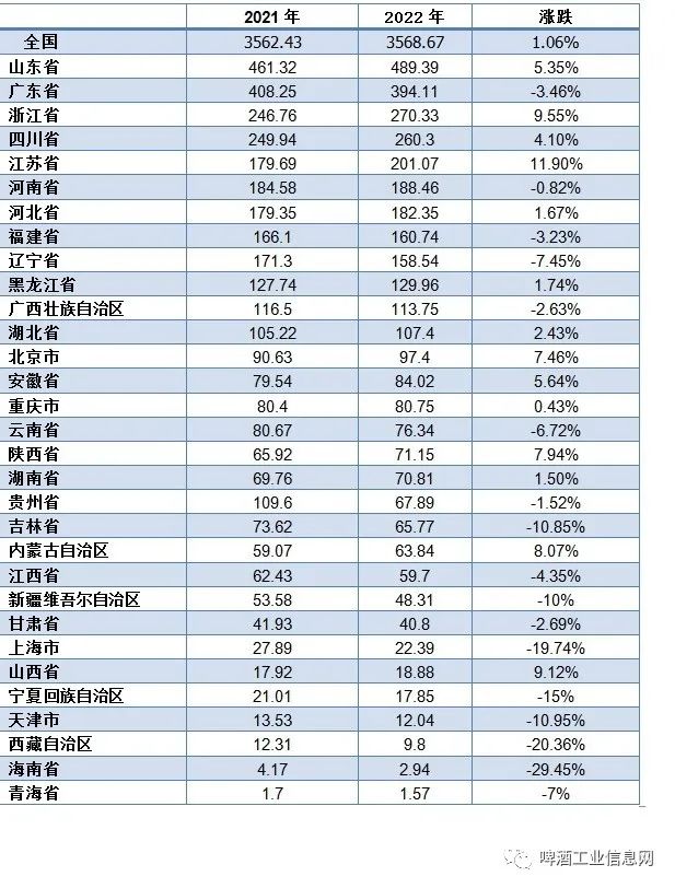排名前五的地区是山东省、广东省、浙江省、四川和江苏。其中,2022年山东省啤酒产量为489万千升,位居第一,占全国总产量的14%。