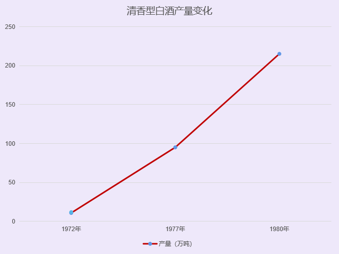 短期内清香工艺迅速席卷全国,清香型占据市场所有香型总份额的近70%,成为分布最广、销量最大、需求最旺盛的白酒香型。清香型酒厂如雨后春笋在全国各地快速涌现,实现1952年的10.8万吨、1977年的95万吨,1980年的215万吨的跃升传奇。