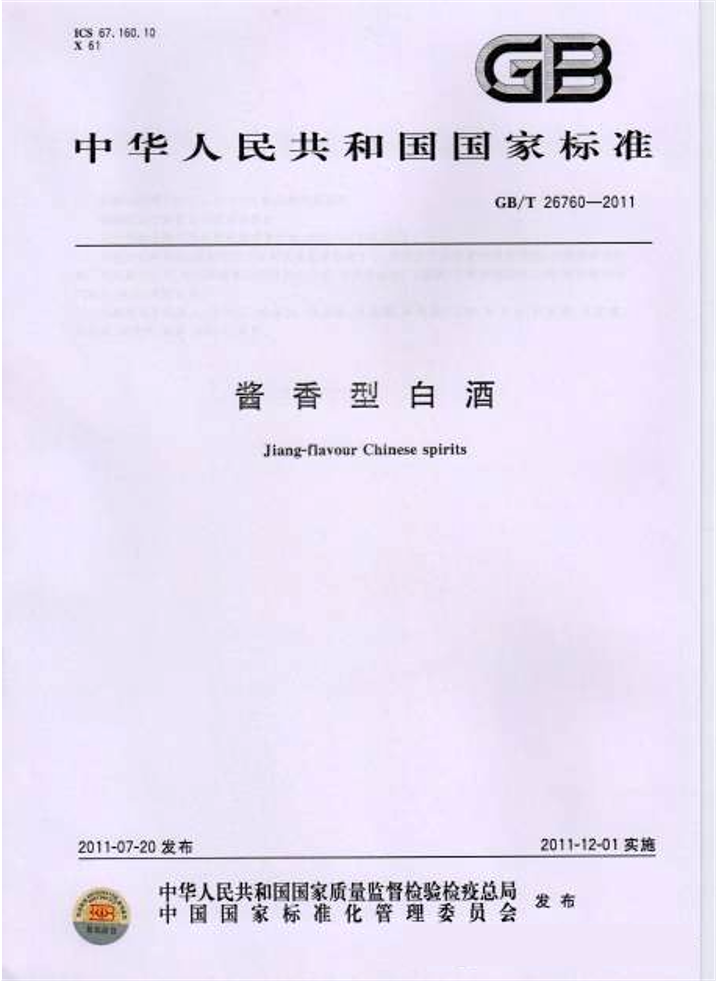 2011年12月,酱香型白酒国家标准真正完成,标准编号:GB/T 26760-2011,规定了酱香型白酒的术语和定义、产品分类、技术要求、实验方法、检验规则、标志、包装、运输和贮存等。