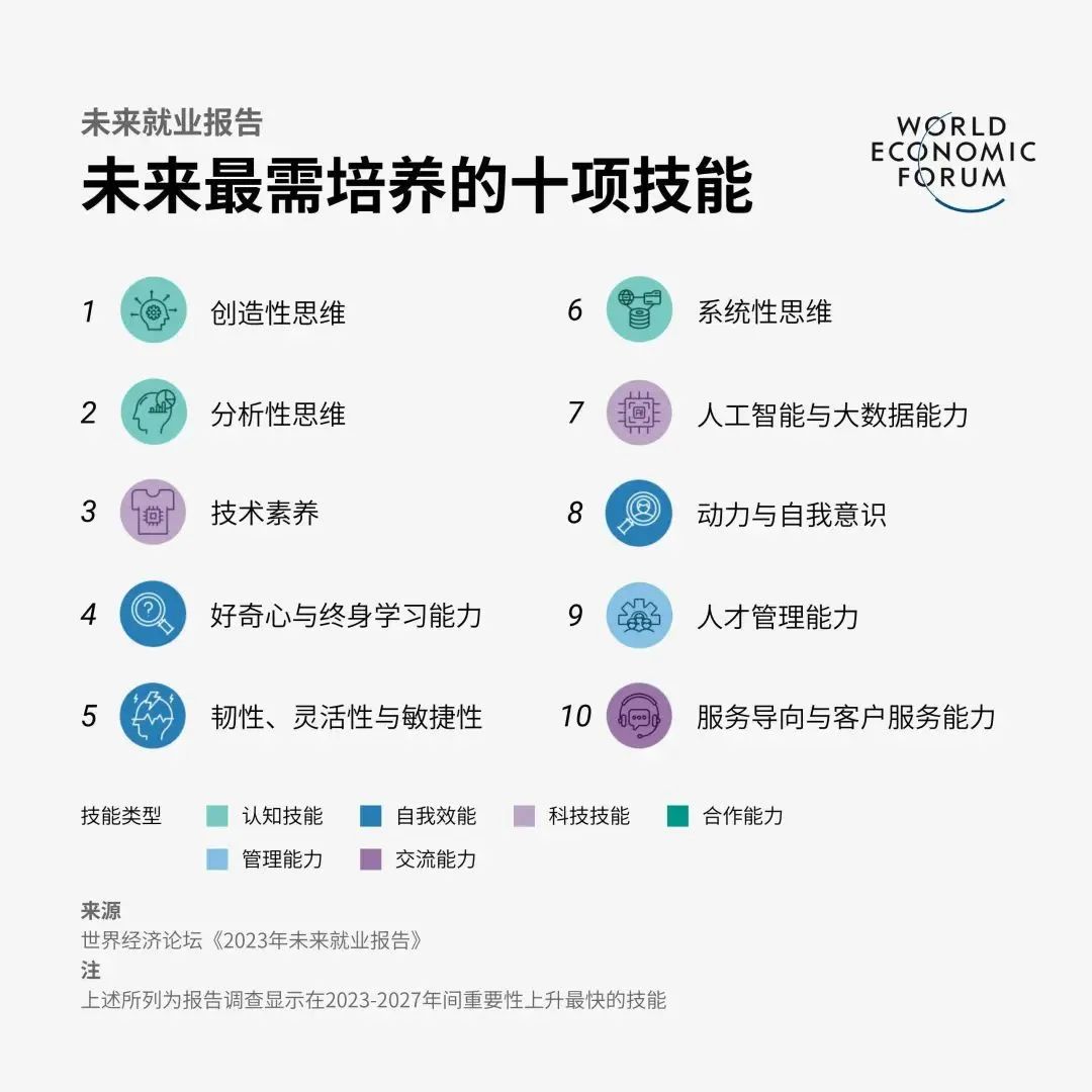 世界经济论坛最近发布了《2023年未来就业报告》报告总结了一些核心就业技能,认为这些技能将在今后的工作中变得至关重要。在公司和企业目前对员工能力的期望排名中,分析和创造性思维能力占据了首要位置。此外,自我效能技能,包括能够承受压力;会变通、机敏;上进心强、能够自我评估;拥有好奇心、能够不断学习等等,也都排进了前五位。