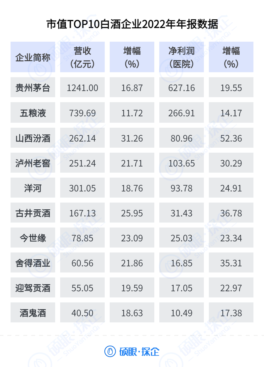 硕眼统计了2022年市值排名前10的白酒上市公司年报,总体来看,排行靠前的龙头企业营收和利润均保持两位数以上增长。仅茅台一家2022年净利润高达627.2亿元,占据了行业近一半的利润。