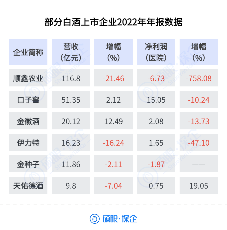 即便是已经上市的酒企,也被第一梯队酒企不断挤压生存空间。国内19家上市酒企中,4家企业营收出现负增长,4家企业净利润出现负增长。其中,出现亏损的企业有两家,分别是顺鑫农业与金种子酒,分别亏损了6.73亿元与1.87亿元。