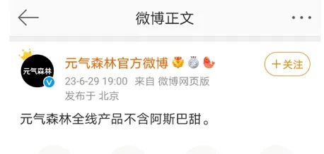元气森林官方微博第一时间发布声明,相关负责人表示,元气森林配料表更干净,全线产品不含阿斯巴甜。