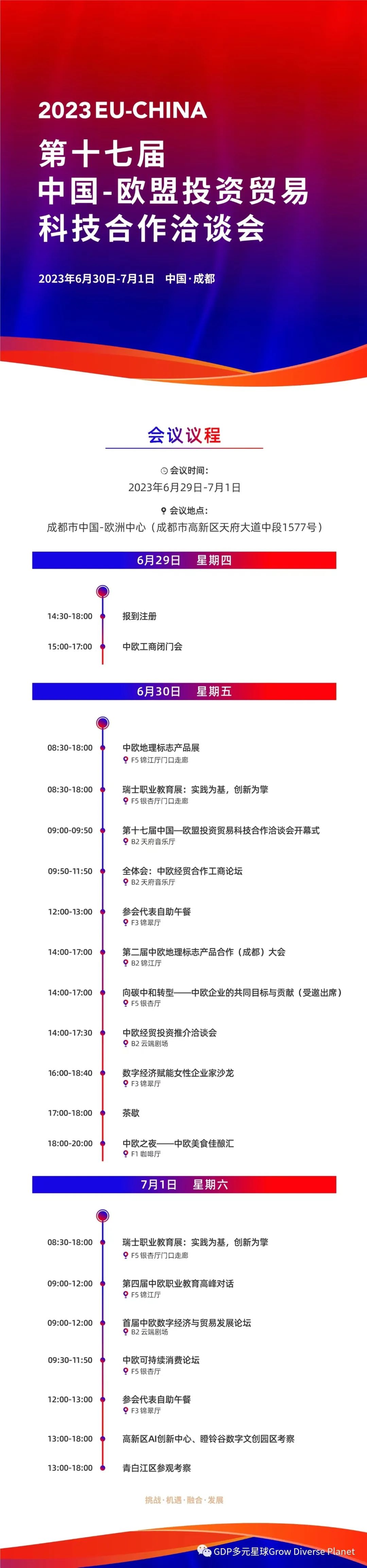 ?本届欧洽会以“挑战 机遇 融合 发展”为主题,将聚焦中欧双方在碳中和、新能源、数字经济、职业教育、绿色可持续等多个领域的交流与合作,举办开幕式、中欧经贸合作工商论坛等10余场会议,同期还将组织中欧地理标志产品展、瑞士职业教育展等展览展示,及青白江区、高新区等参观考察活动,进一步促进中欧民间经贸深度合作。来自中欧各领域的官员、专家、学者、企业家等2,000余名嘉宾及代表,将通过线上线下相结合的方式,共享中欧双边经贸合作“成都机遇”。