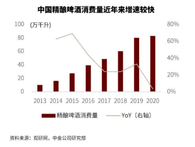 从2021年起,中国的精酿啤酒市场蓬勃发展,正逐渐进入大众市场。资本市场验证了精酿啤酒的火爆,2021至2022年的融资事件超过前六年总和。五大啤酒巨头都推出了各自的精酿啤酒产品。主打鲜打闪送的优布劳已在全国800个城市及区县开出了2000家门店,在商业模式上探寻出了另一种可能性。中产作为精酿啤酒的主要消费者,在下班后喝上一杯已成为他们的日常。显然,精酿啤酒行业正在加速奔跑。然而,在大环境向好的同时,精酿啤酒企业并非都能够吃到红利,这其中,有行业发展不够成熟的因素,也有企业自身实力的原因。2013年,中国啤酒产量见顶后开始步入下行轨道,传统啤酒巨头开始调整产品结构,他们的目标一致,都在转型高端。传统啤酒转型与精酿啤酒的加速发展在时间上一致,2013年,精酿啤酒开始得到资本市场关注,行业开始进入高速成长期。中金数据显示,精酿啤酒相关企业的注册数量从2013年的不足百家到2019年超过1000家。