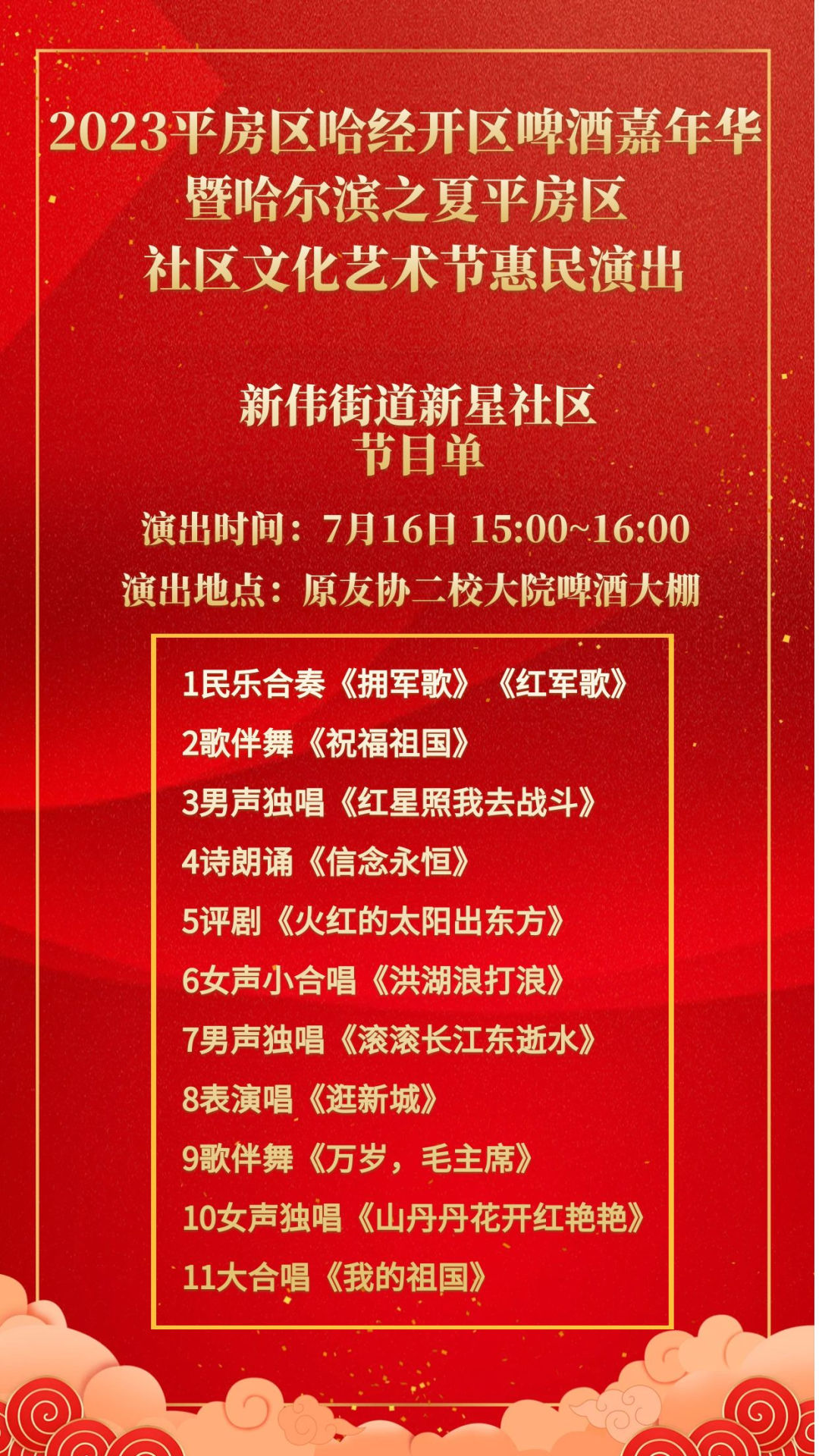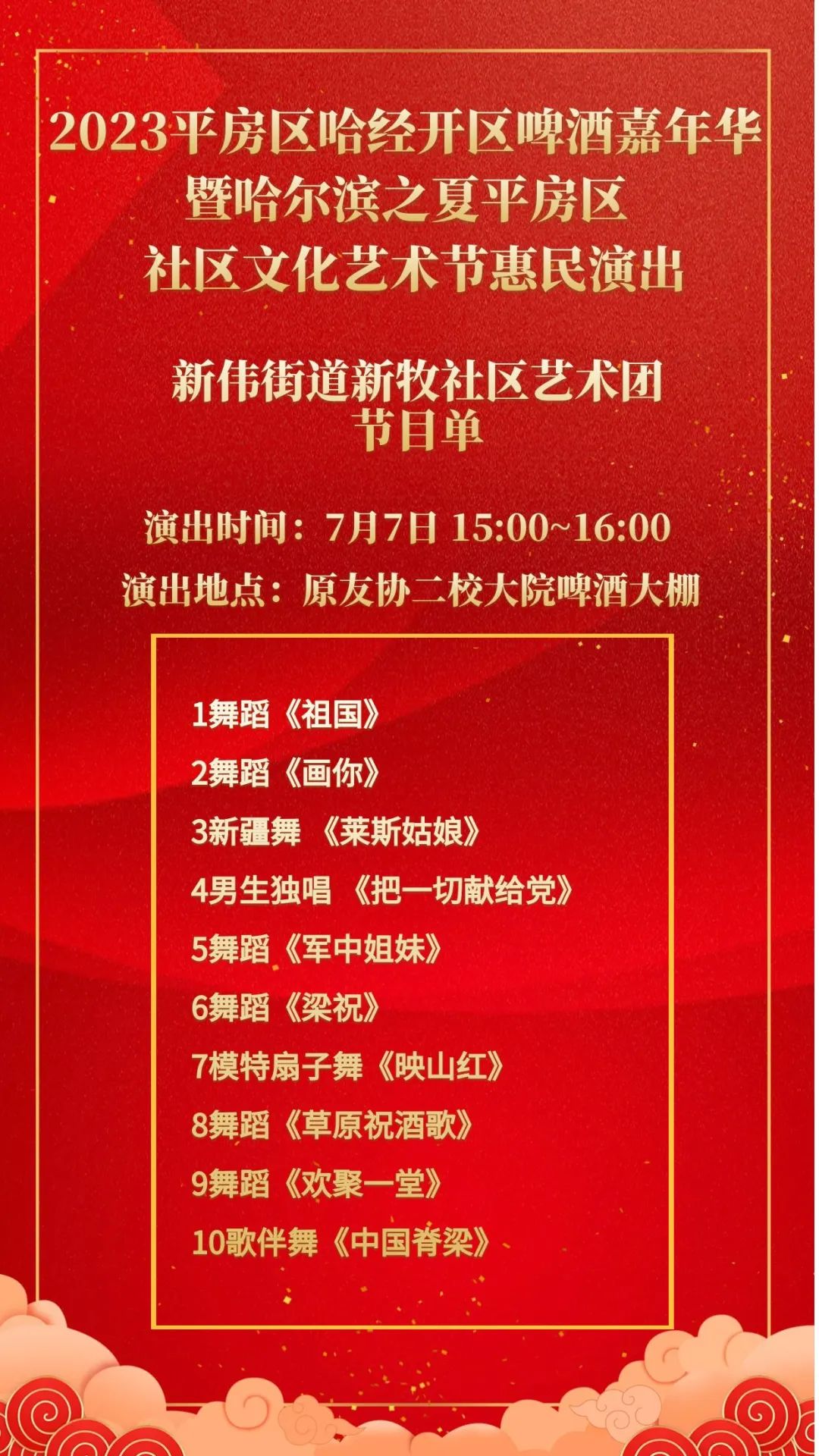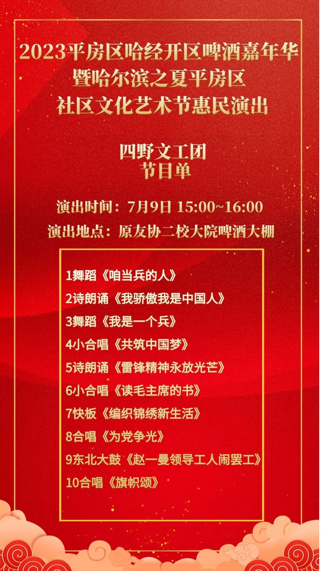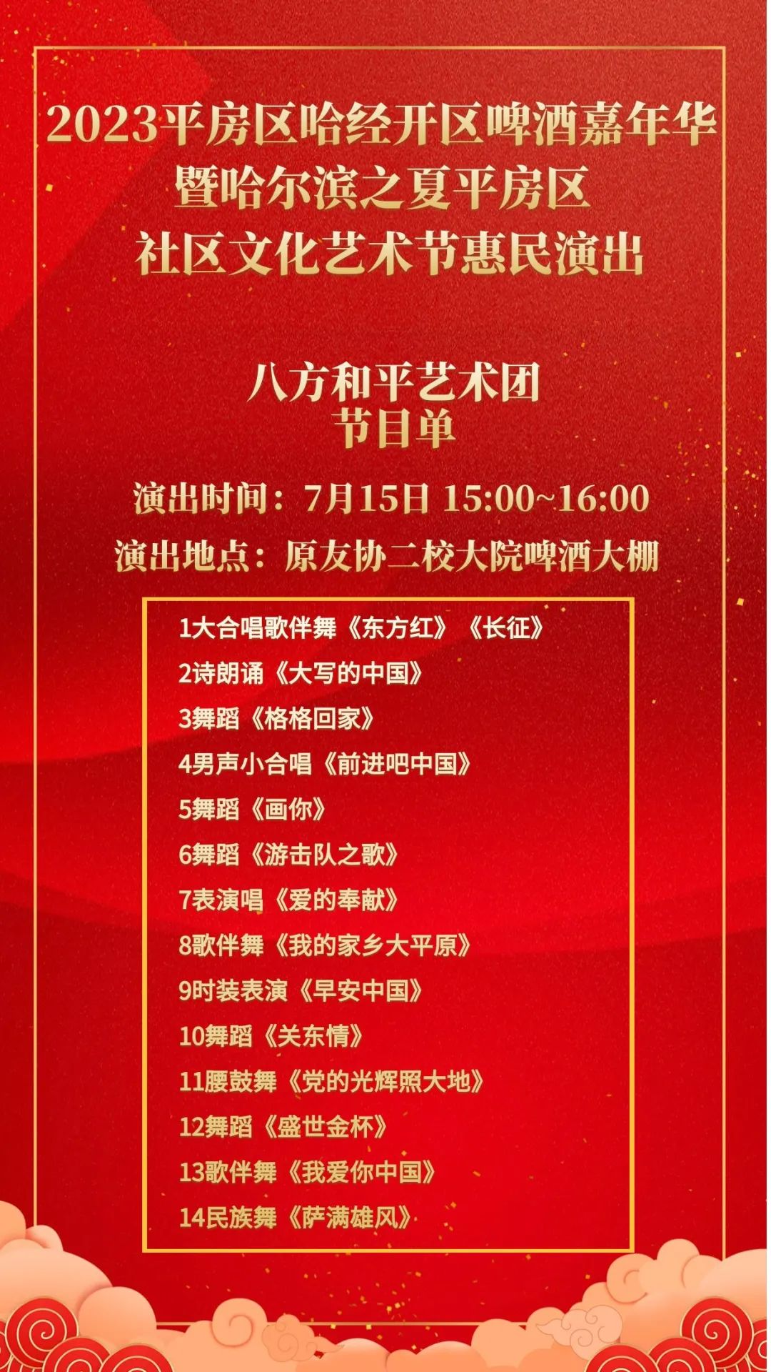 为贯彻落实黑龙江省文旅厅、哈尔滨市文旅局文化活动计划工作总体安排,大力推进文化惠民工程,长期、持续开展文化惠民演出,以习近平新时代中国特色社会主义思想为指导,坚持以人民为中心的发展理念,自觉担负起举旗帜、聚民心、育新人、兴文化、展形象的使命任务,不断满足人民群众日益增长的文化需求,进一步推动哈尔滨市文化工作高质量发展,平房区文化旅游和文博服务中心,开展2023平房区哈经开区啤酒嘉年华暨哈尔滨之夏平房区社区文化艺术节惠民演出活动。
