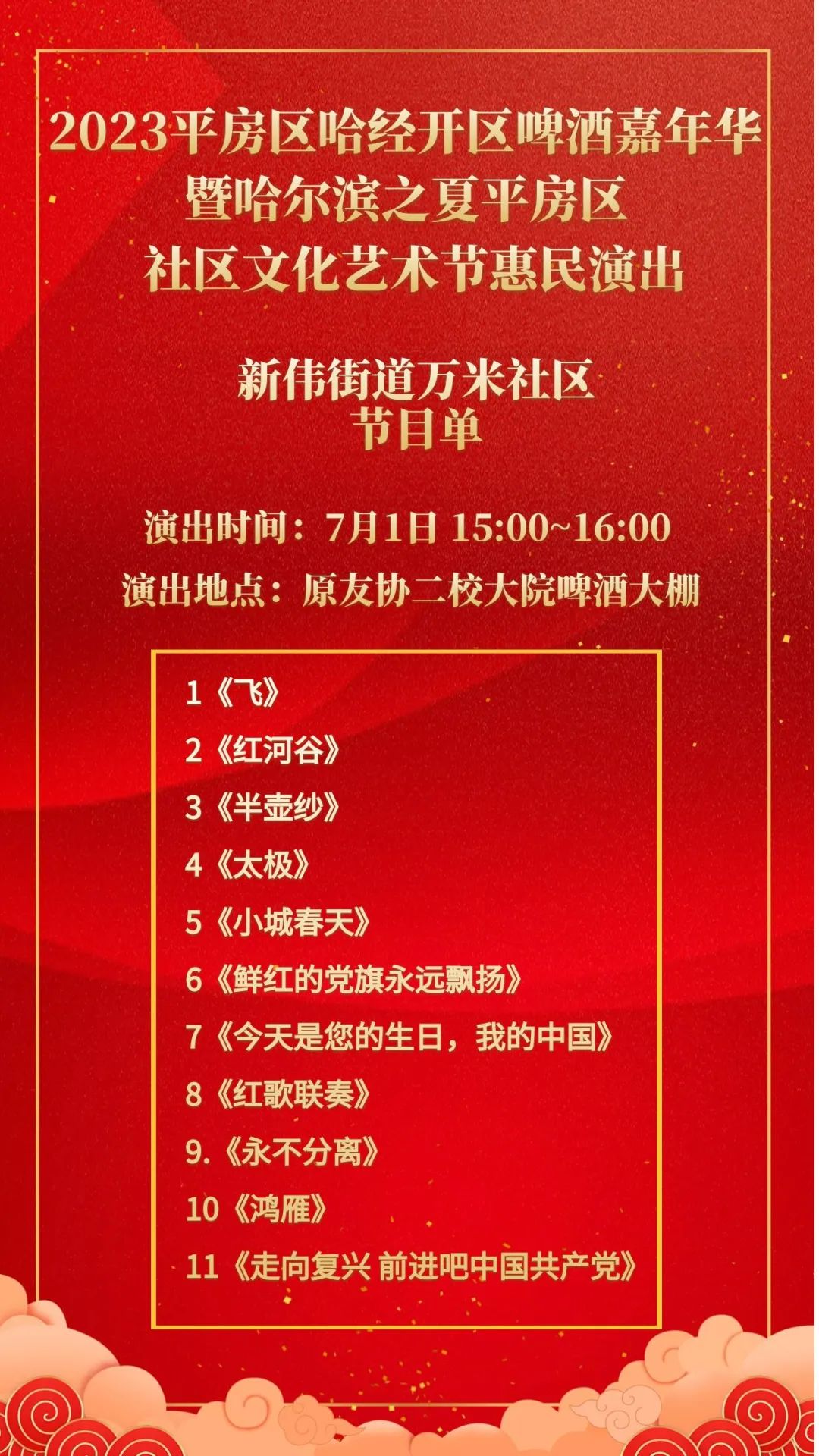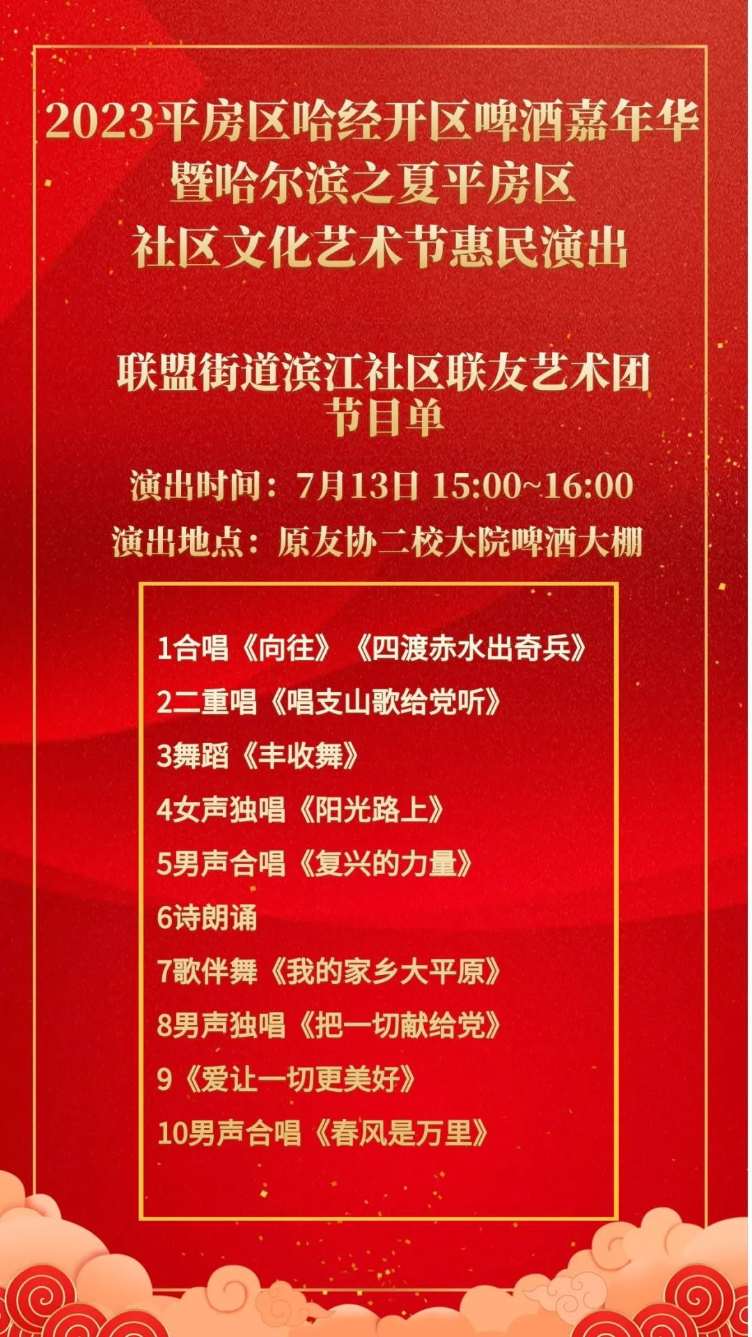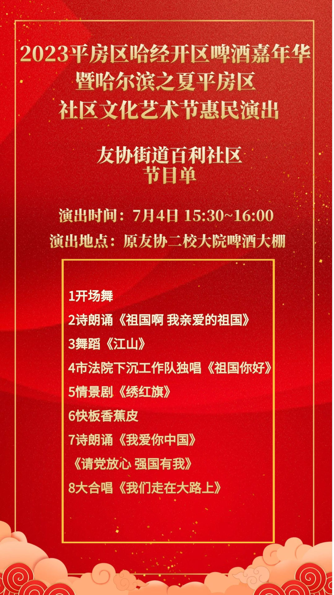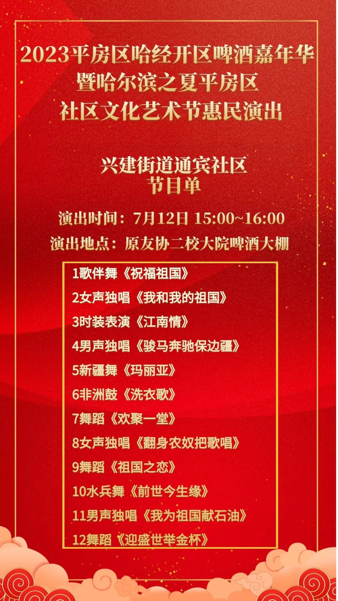 为贯彻落实黑龙江省文旅厅、哈尔滨市文旅局文化活动计划工作总体安排,大力推进文化惠民工程,长期、持续开展文化惠民演出,以习近平新时代中国特色社会主义思想为指导,坚持以人民为中心的发展理念,自觉担负起举旗帜、聚民心、育新人、兴文化、展形象的使命任务,不断满足人民群众日益增长的文化需求,进一步推动哈尔滨市文化工作高质量发展,平房区文化旅游和文博服务中心,开展2023平房区哈经开区啤酒嘉年华暨哈尔滨之夏平房区社区文化艺术节惠民演出活动。