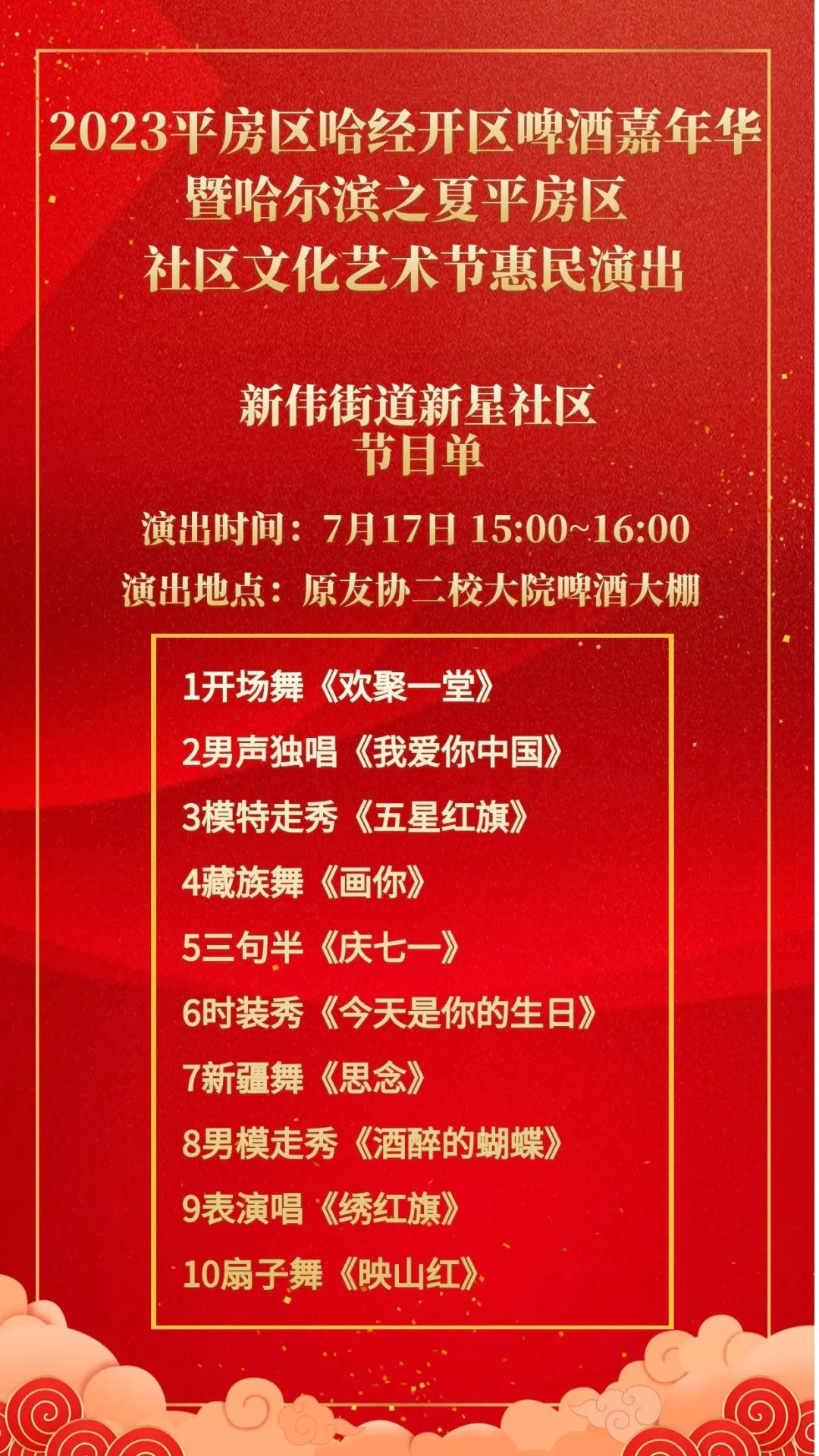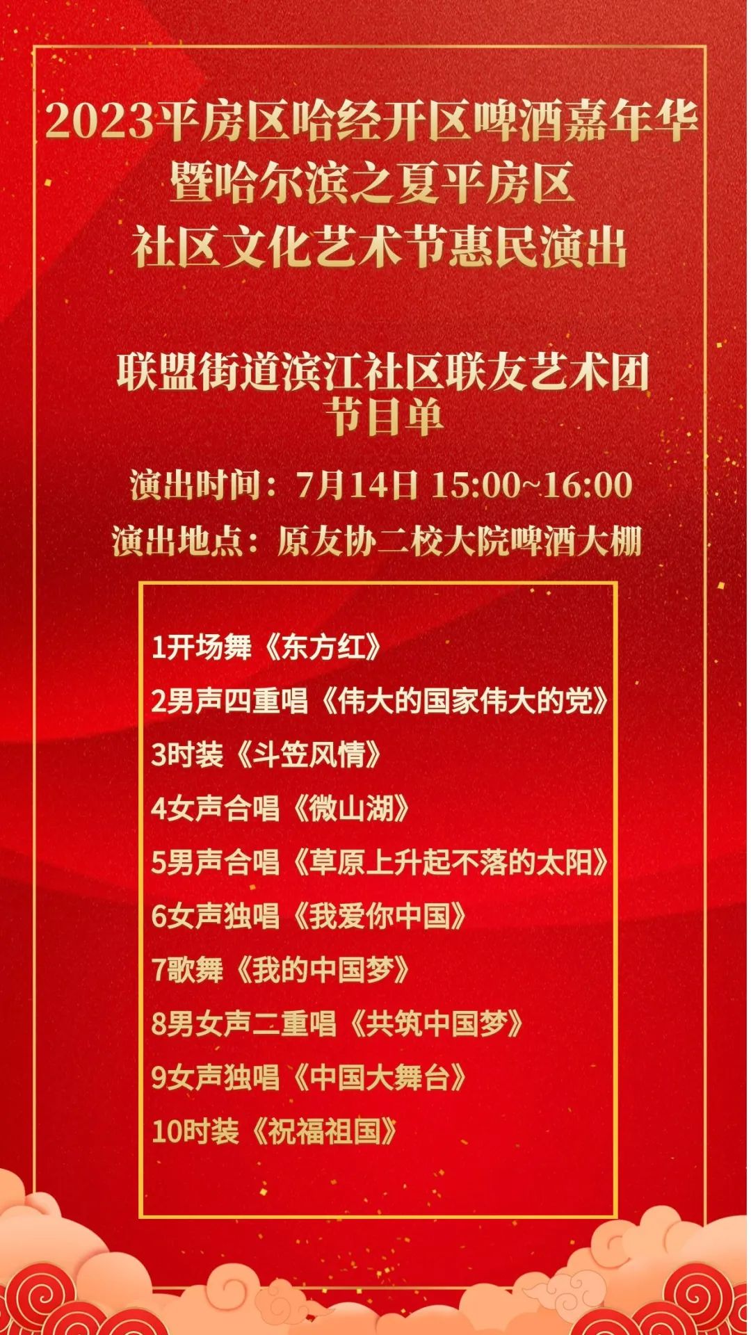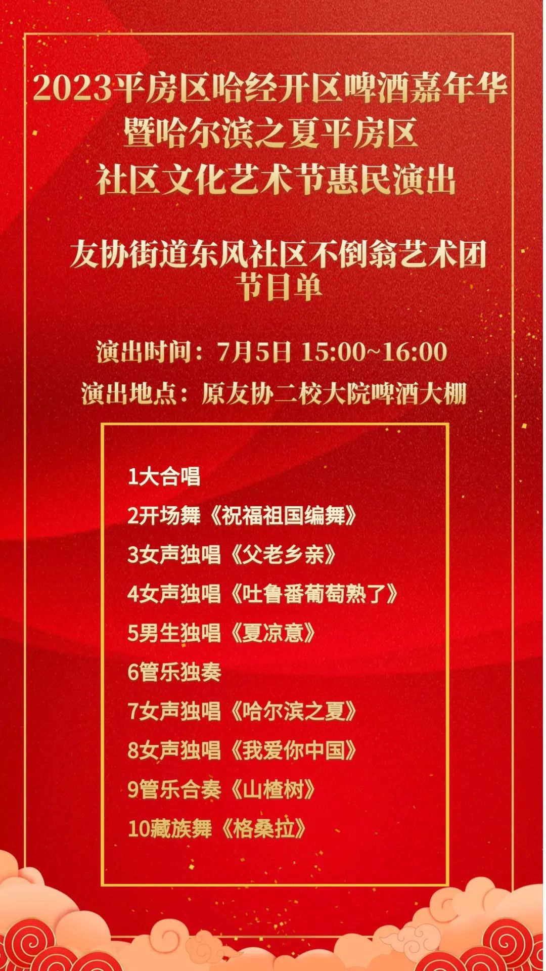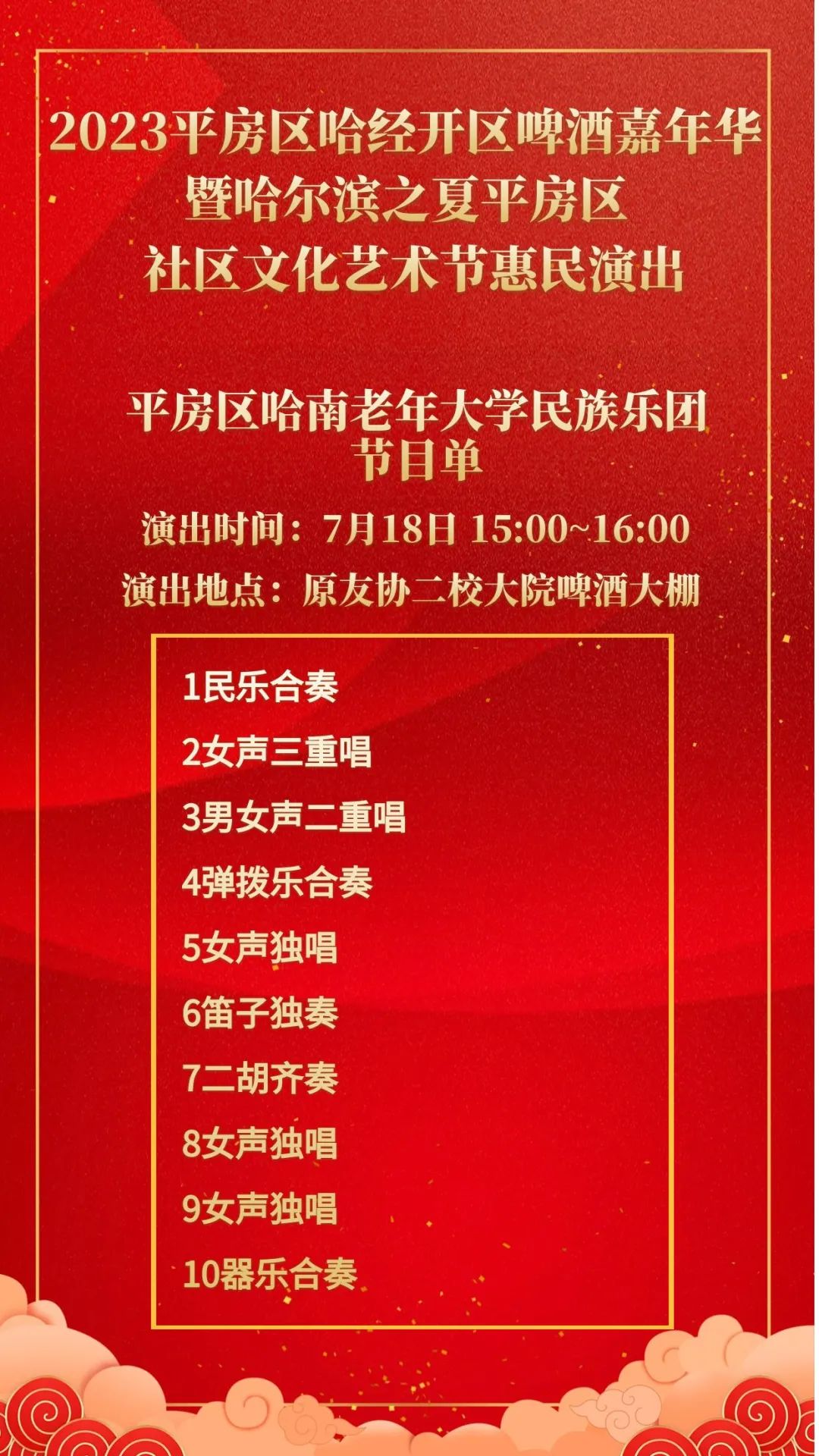 为贯彻落实黑龙江省文旅厅、哈尔滨市文旅局文化活动计划工作总体安排,大力推进文化惠民工程,长期、持续开展文化惠民演出,以习近平新时代中国特色社会主义思想为指导,坚持以人民为中心的发展理念,自觉担负起举旗帜、聚民心、育新人、兴文化、展形象的使命任务,不断满足人民群众日益增长的文化需求,进一步推动哈尔滨市文化工作高质量发展,平房区文化旅游和文博服务中心,开展2023平房区哈经开区啤酒嘉年华暨哈尔滨之夏平房区社区文化艺术节惠民演出活动。