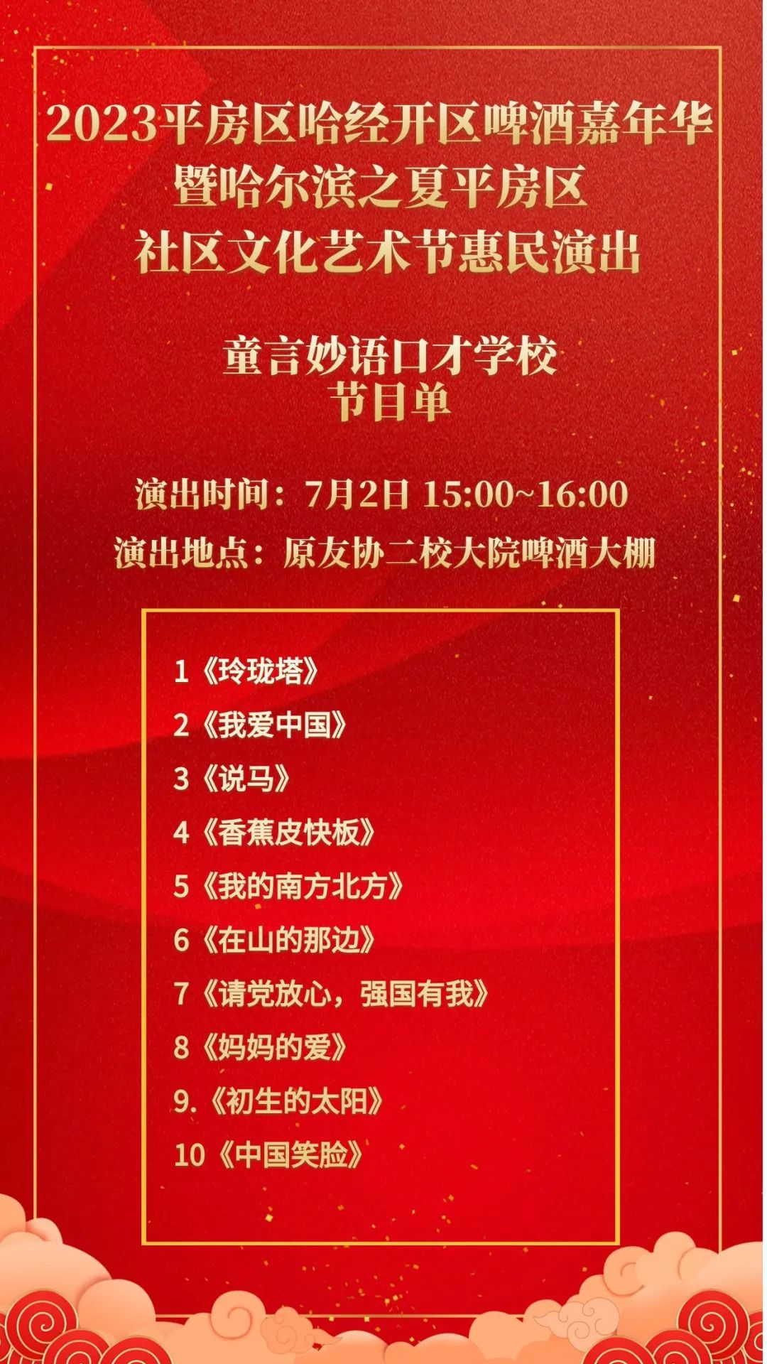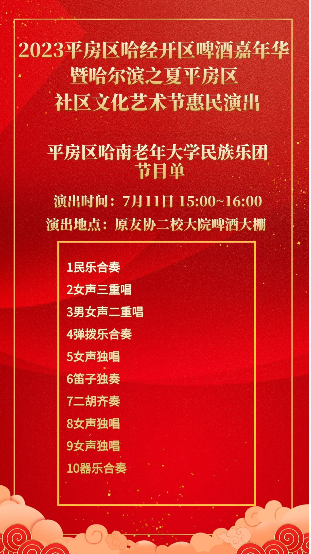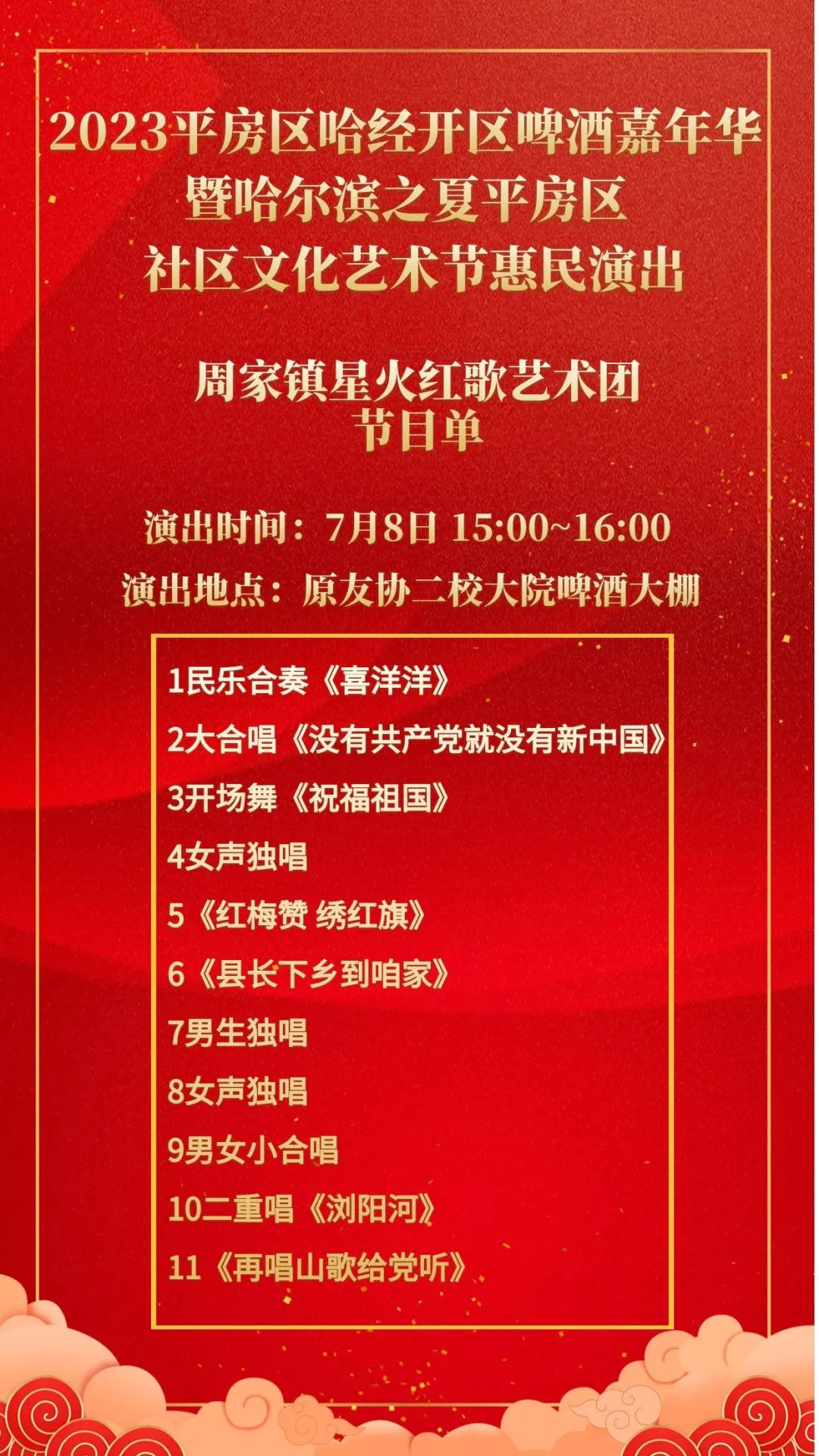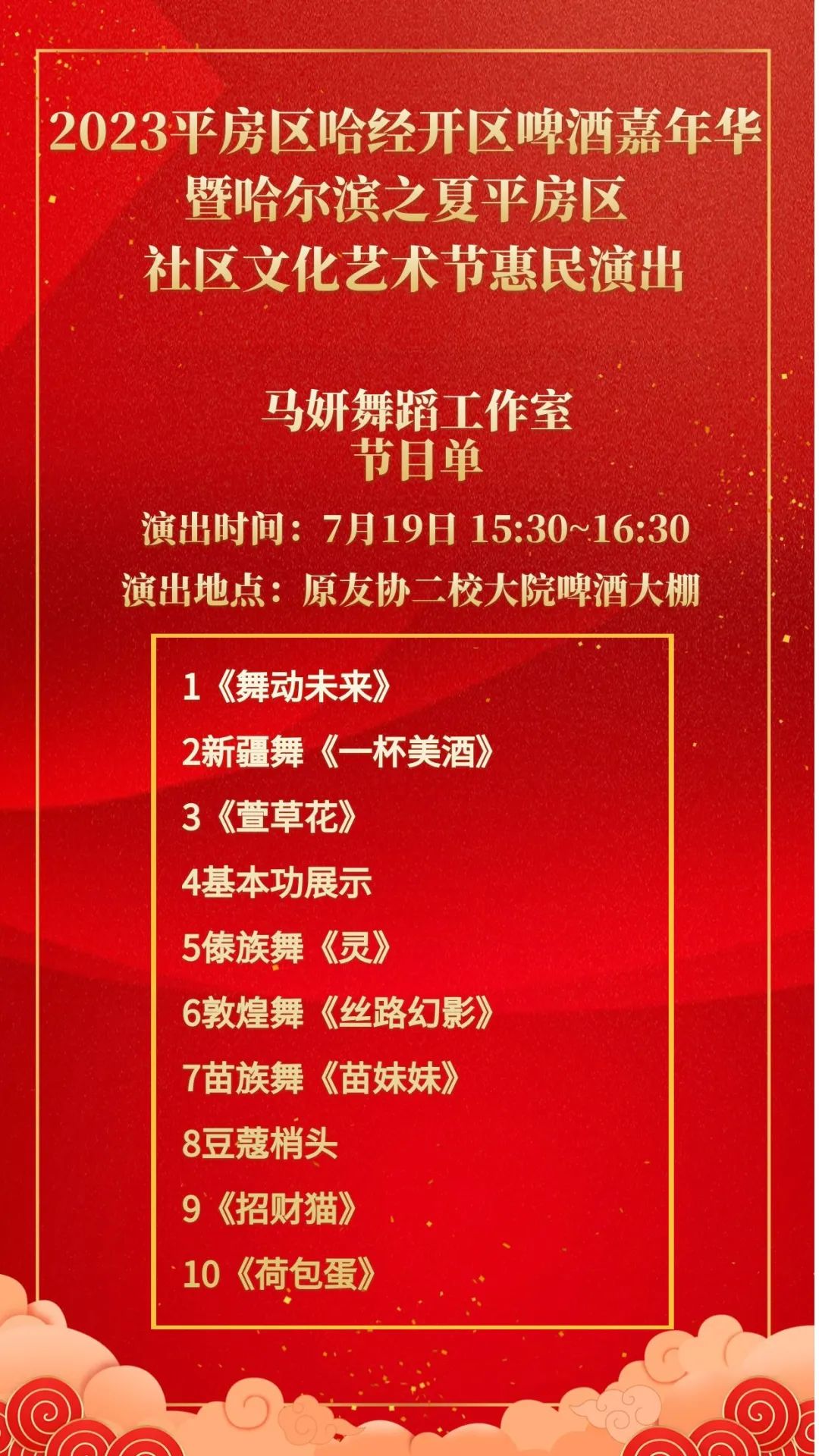 为贯彻落实黑龙江省文旅厅、哈尔滨市文旅局文化活动计划工作总体安排,大力推进文化惠民工程,长期、持续开展文化惠民演出,以习近平新时代中国特色社会主义思想为指导,坚持以人民为中心的发展理念,自觉担负起举旗帜、聚民心、育新人、兴文化、展形象的使命任务,不断满足人民群众日益增长的文化需求,进一步推动哈尔滨市文化工作高质量发展,平房区文化旅游和文博服务中心,开展2023平房区哈经开区啤酒嘉年华暨哈尔滨之夏平房区社区文化艺术节惠民演出活动。
