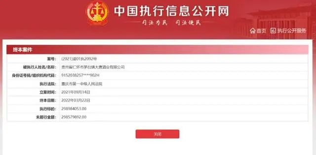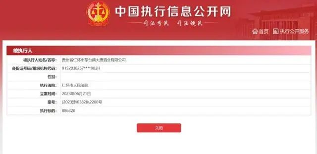 近日,从中国执行信息公开网获悉,贵州省仁怀市茅台镇大唐酒业有限公司(以下简称:大唐酒业)因未按时履行法律义务,于6月22申请被强制执行,执行标的886320,案号为(2023)黔0382执2280号。