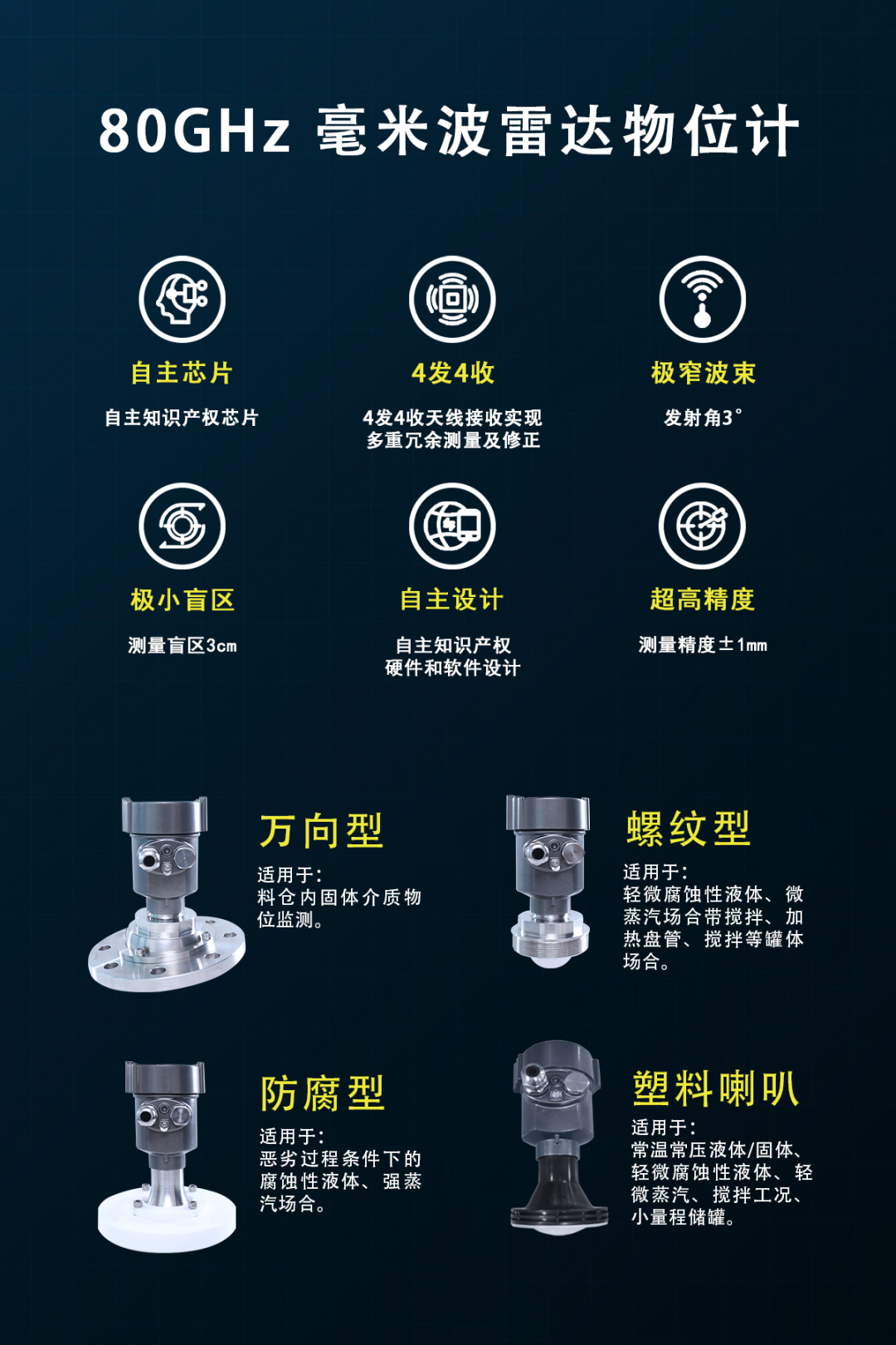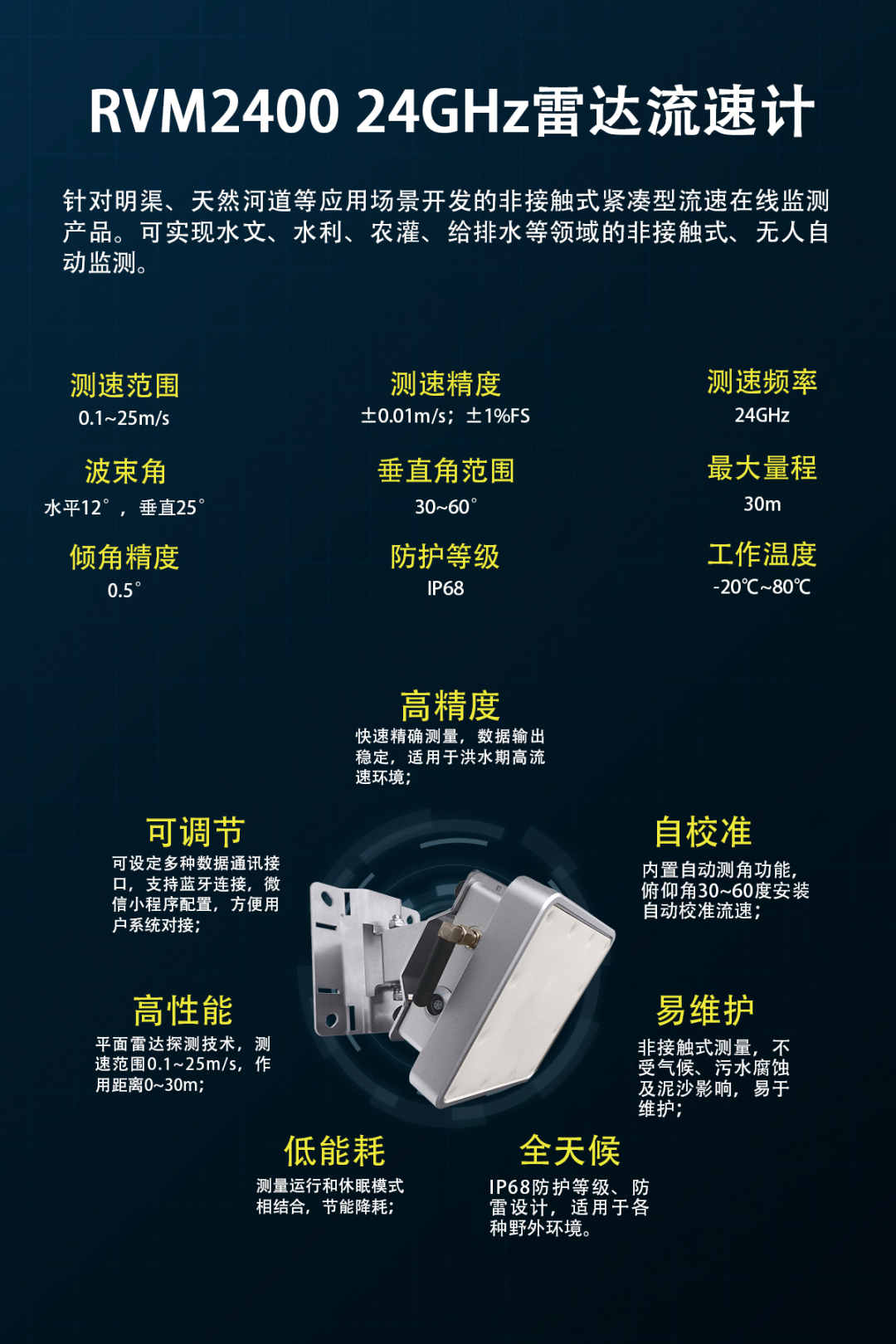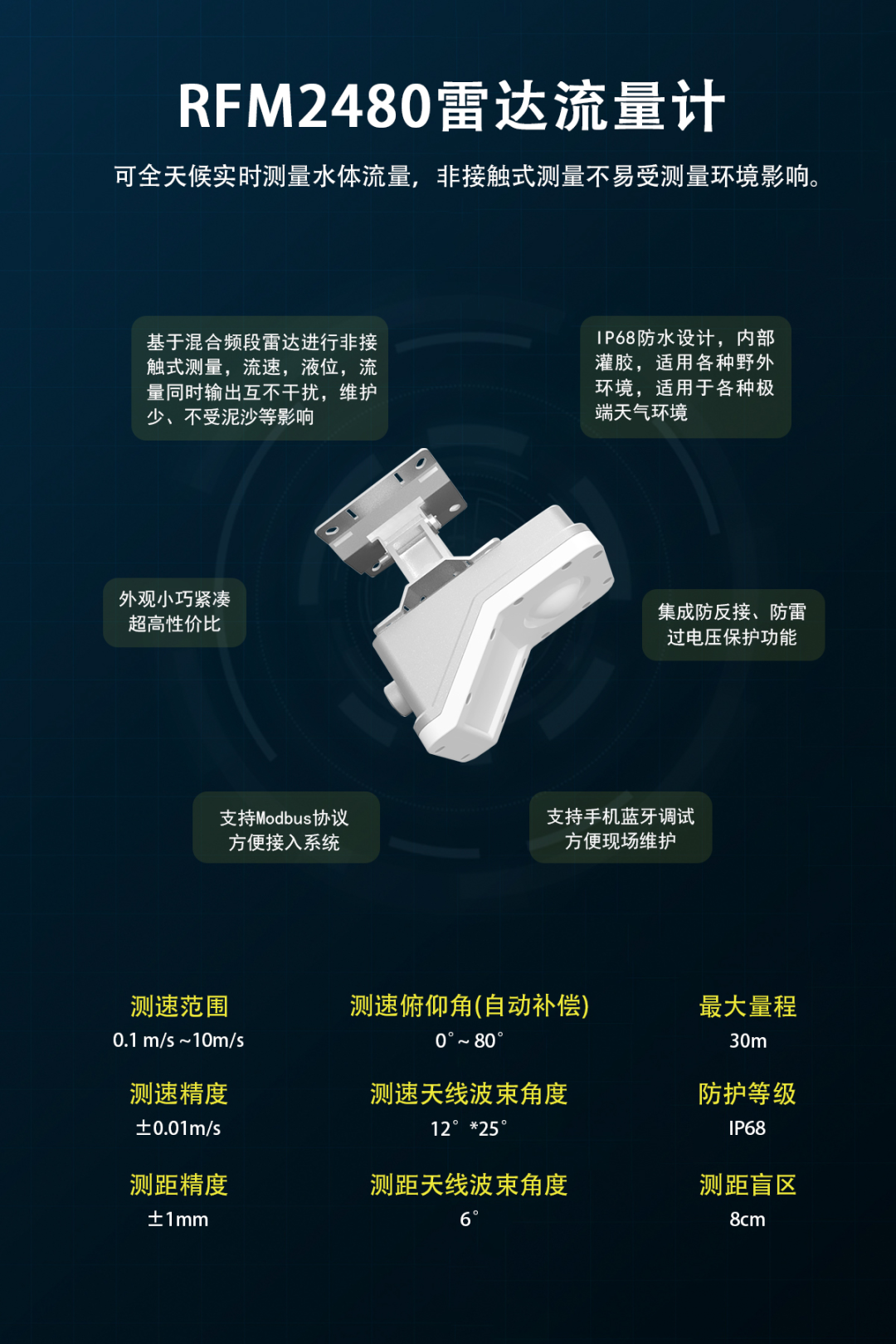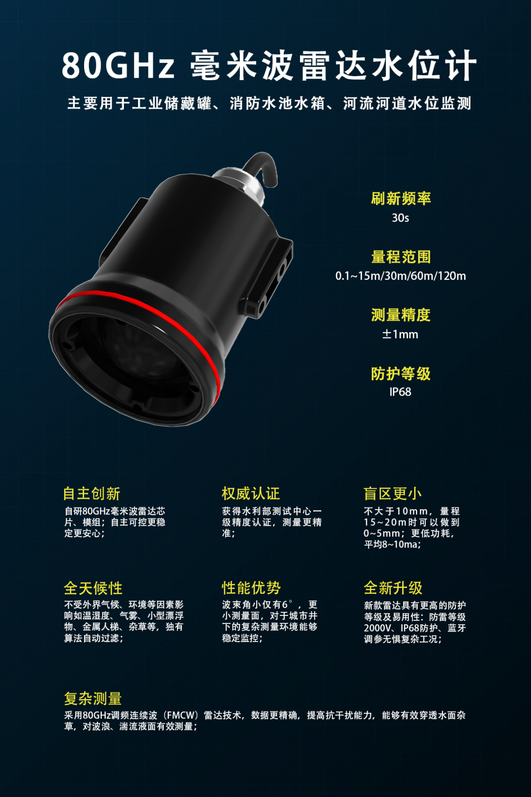 在水利水务监测方面公司已推出:80GHz毫米波雷达水位计、雷达流速计、雷达流量计、80GHz连续调频波雷达物位计等非接触式测距、测速产品,不受泥沙、水草等杂物影响,具有测量准确,可靠性高,免维护,低功耗的特点,广泛适用于城市管网、明渠河流、水库湖泊等应用场景的水位、流速、流量的精准监测。