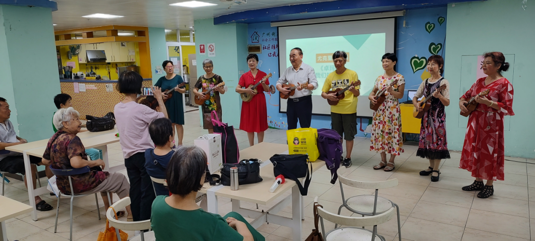 家属们表演尤克里里弹唱《卓玛拉》