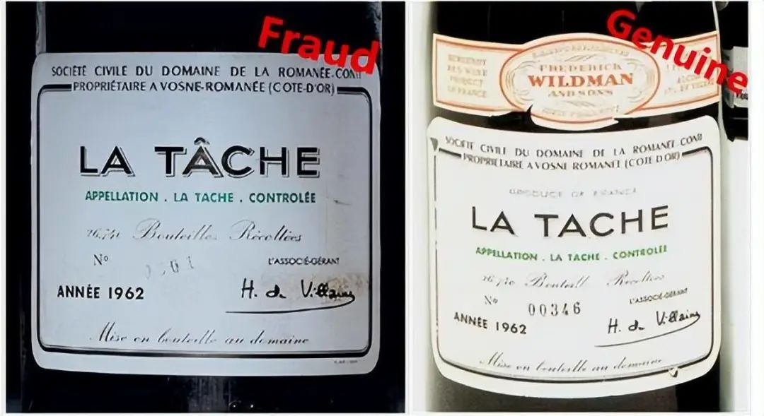 这是一个更相似的La Tache葡萄酒标签的仿冒品。但细心的饮酒者指出,在1962年的葡萄酒标签上不应该有这个标签。1962年的19号和62号不在一个水平线上。瓶子上的号码是0001还是0601?.细心的网友发现了几个错误。