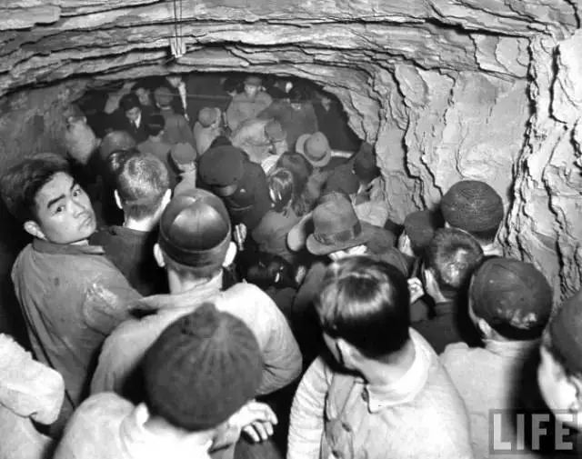 重庆,百姓进入防空洞,躲避日机轰炸。卡尔·迈登斯/摄,大约拍摄于1940-1941年。