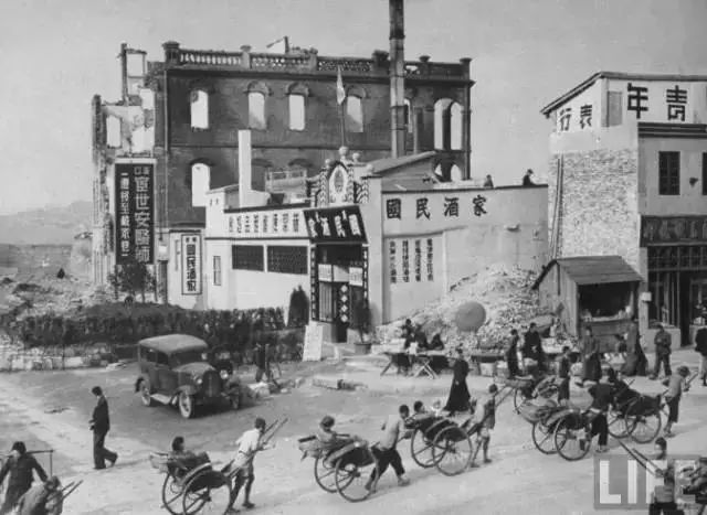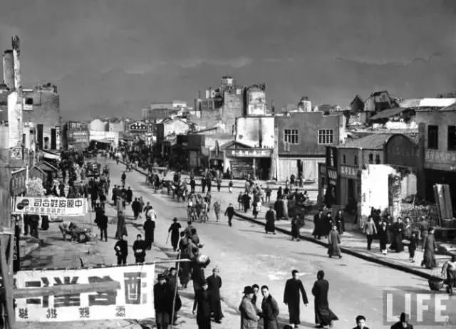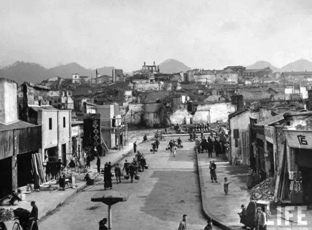 重庆,被日机轰炸后残破的商业街。卡尔·迈登斯/摄,大约拍摄于1940-1941年。