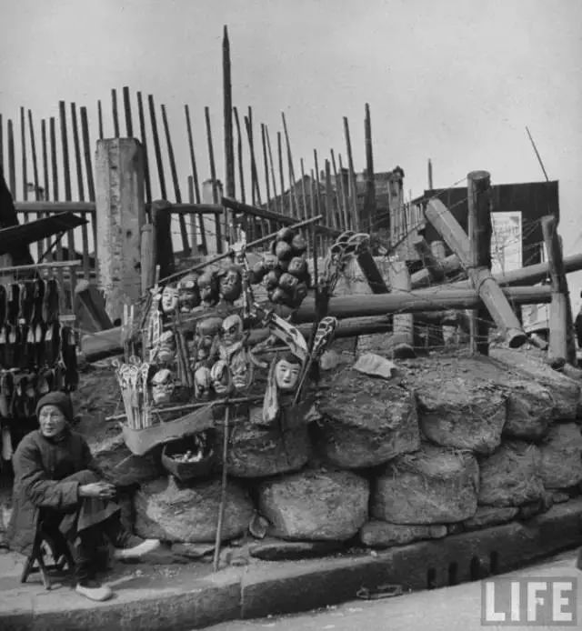 重庆,废墟前卖面具、木刀等儿童玩具的小贩。卡尔·迈登斯/摄,大约拍摄于1940-1941年。
