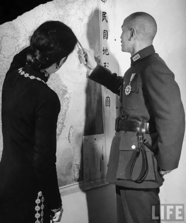 重庆,蒋介石与宋美龄观看地图,研究抗战形势。卡尔·迈登斯/摄,大约拍摄于1940-1941年。