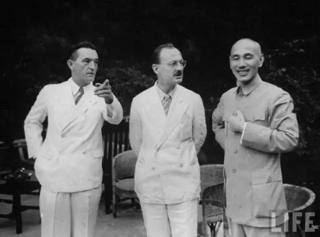 重庆,蒋介石与陈纳德(左)、美国汉学家也是蒋的政治顾问欧文·拉铁摩尔(中)。卡尔·迈登斯/摄,大约拍摄于1940-1941年。
