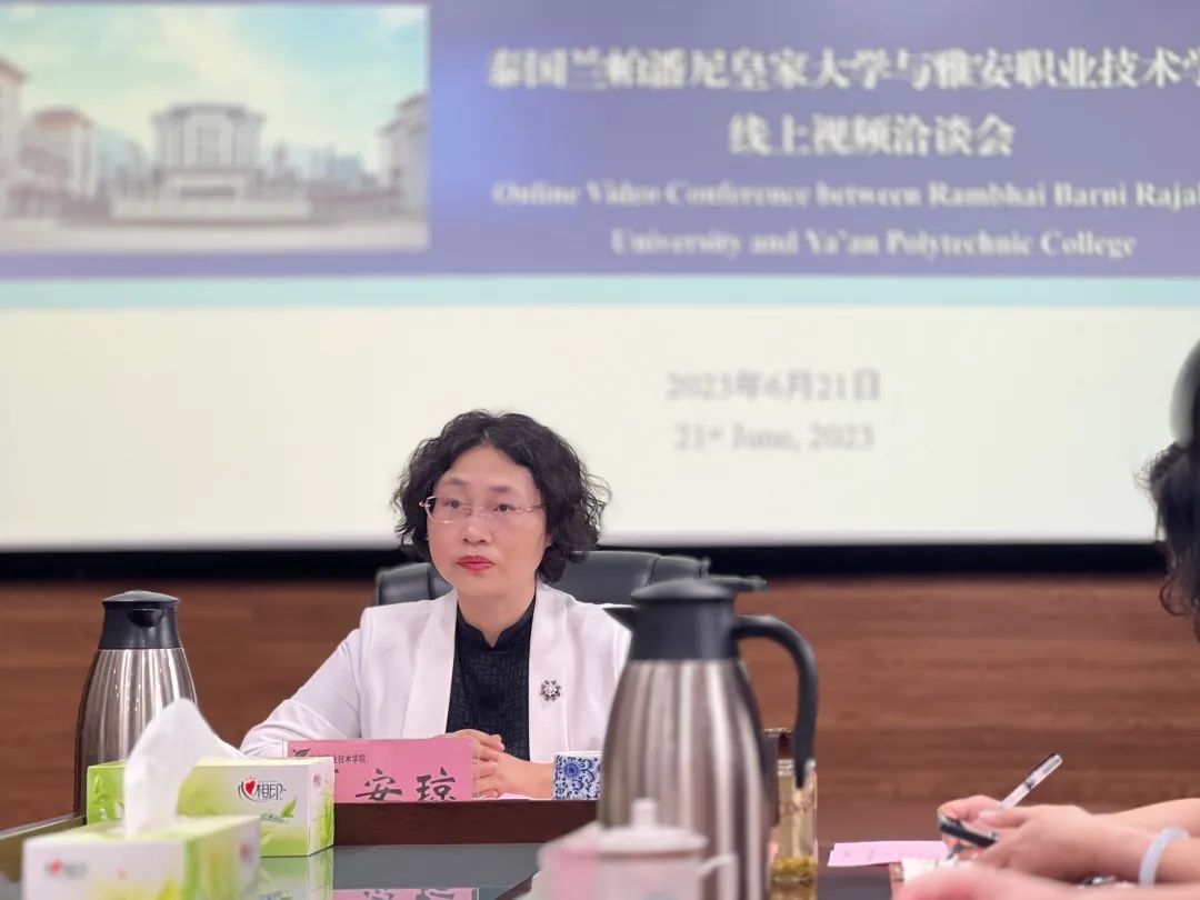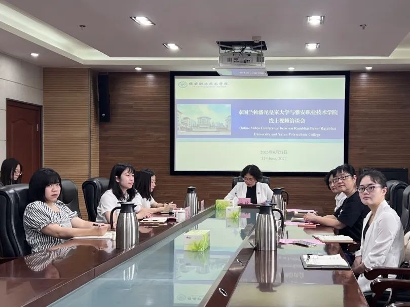 6月21日上午,学院在经开区校区综合楼303会议室召开了泰国兰帕潘尼皇家大学线上视频洽谈会。学院工会主席夏安琼,继续教育与国际交流处处长李柚、副处长文艺;泰国兰帕潘尼皇家大学副校长比雅楠、萨瓦猜,国际教育中心中方主任张德俊等双方相关二级学院负责人参加了此次会议。夏安琼对前期学院在泰国兰帕潘尼皇家大学开展的两期线上非学历教育中文培训进行了介绍和总结,并提出了下一步合作的方向。她提出希望:一是双方能签署汉语言海外教学基地合作协议,在兰帕潘尼皇家大学建立雅安职业技术学院汉语言海外教学基地,在前期合作基础上,泰方能采用我校开发的汉语专业标准和课程;二是双方能开展护理类专业的科研的合作,共建国际科研平台,共享师资、专业课程开发与建设等;三是拓展医学卫生类专业合作,开展“中文+应急救护职业技能/中医适宜技术职业技能”培训,能与泰国医院进行中医药国际交流与合作项目。