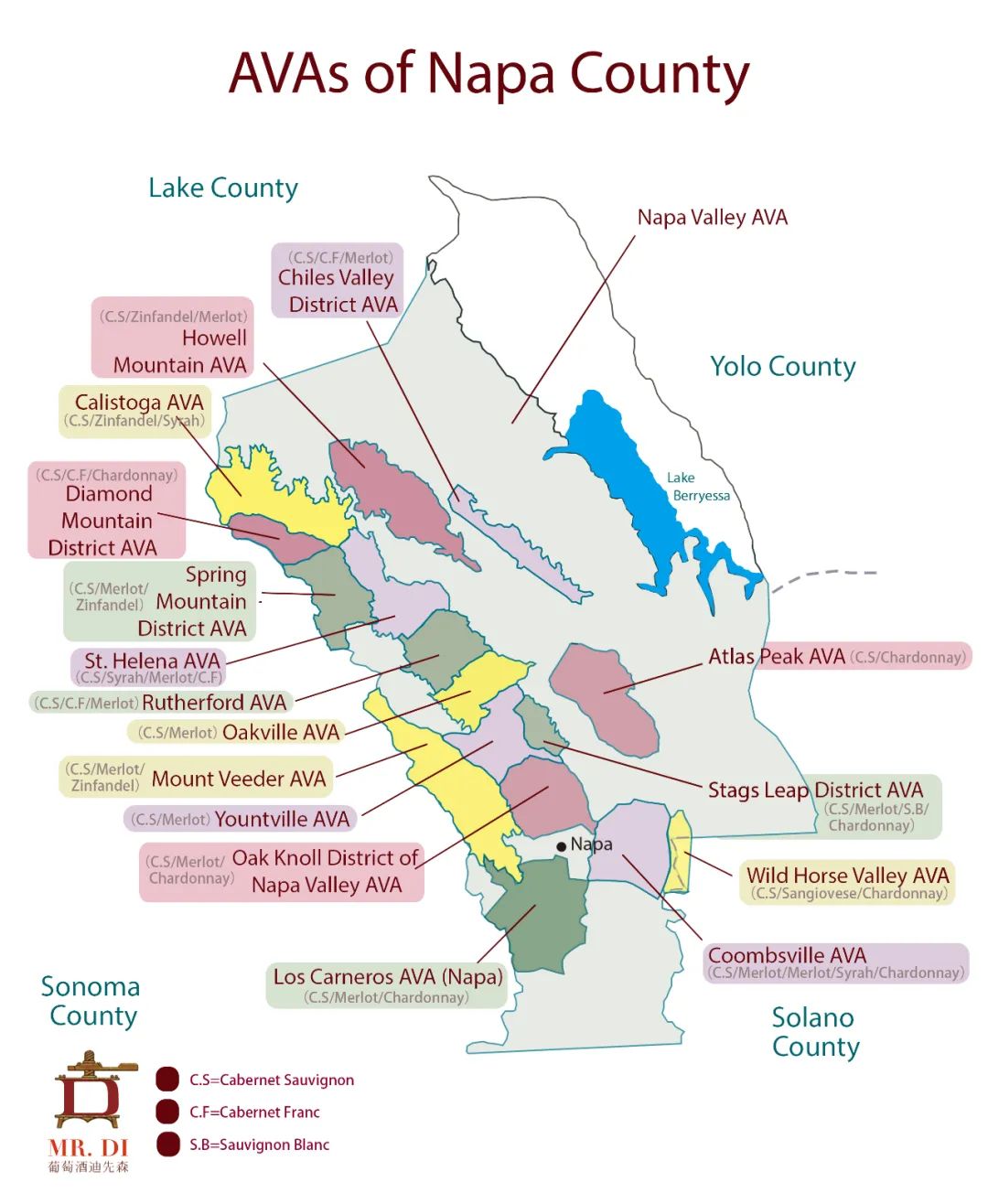 门多西诺县:面积大,著名的法定产区和品种为:安德森谷AVA的雷司令和琼瑶浆。门多西诺AVA以赤霞珠、金粉黛和西拉为主。