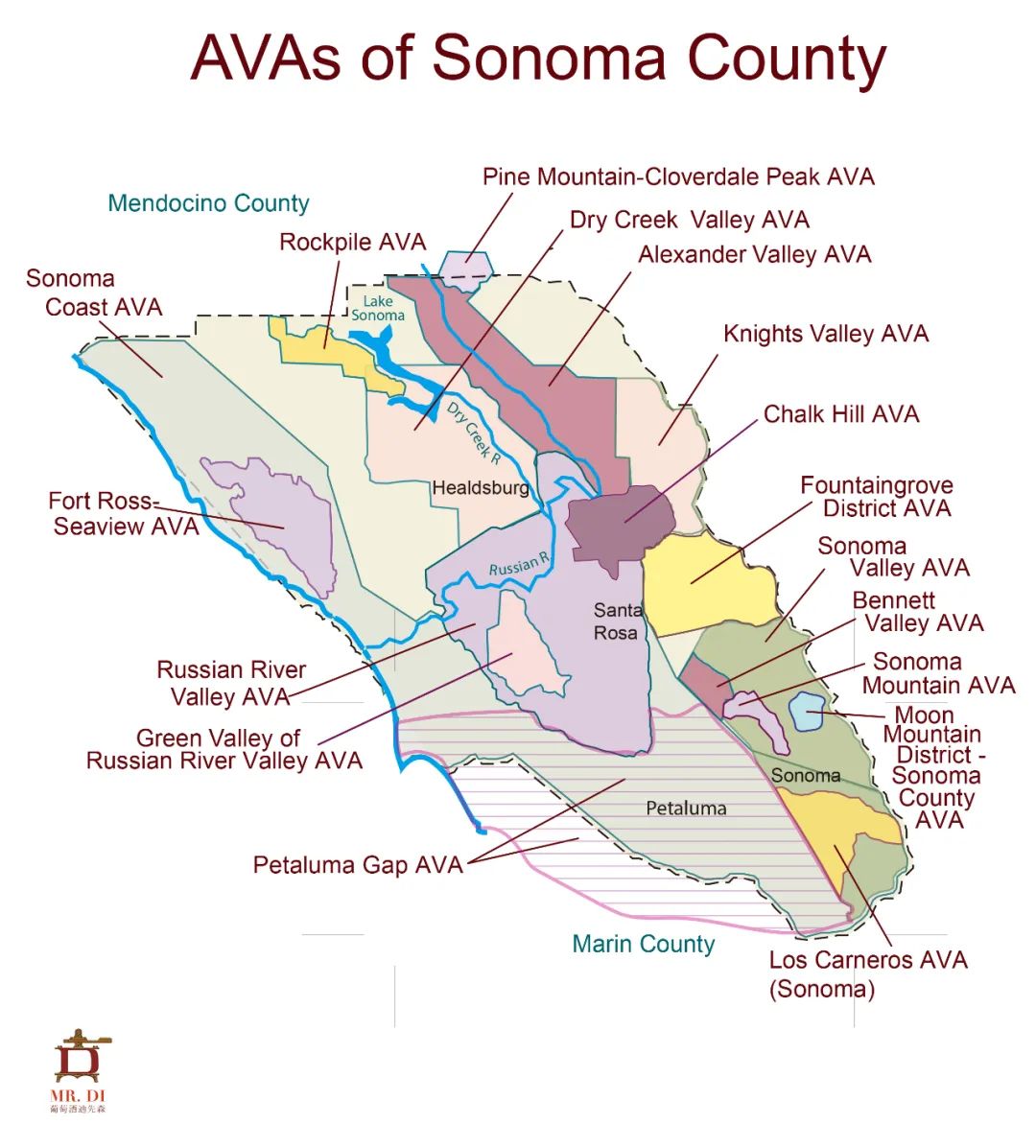 ②索诺玛县和门多西诺县:索诺玛县比纳帕县的面积大,气候更多样。沿海山脉中有一个豁口叫做佩塔卢马峡口,给当地造成了不同的气候条件。