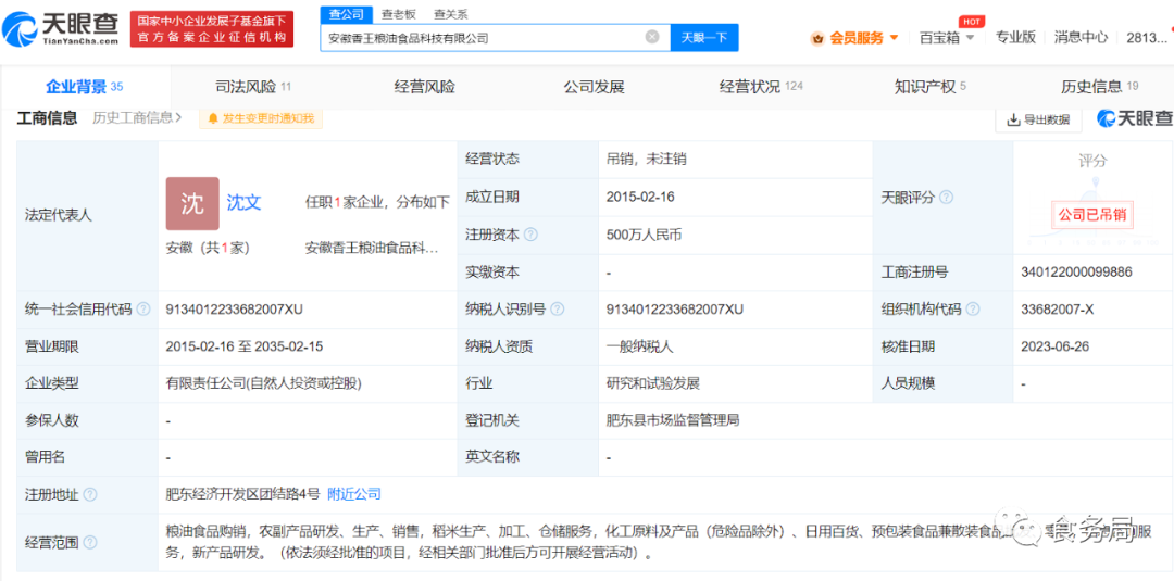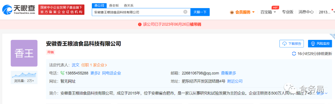 近日,安徽香王粮油食品科技有限公司发生工商变更,经营状态由存续变更为被吊销。