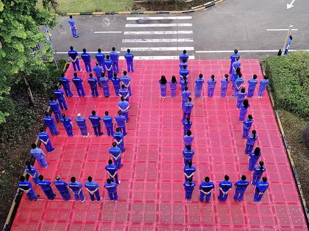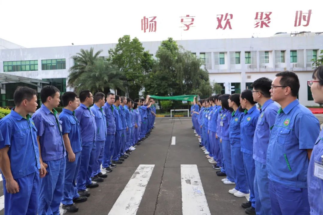 紧接是庄严的旗帜传递过程,在《荣誉》歌声的见证下,60名员工排成两列纵队,旗帜高举,从每位员工头顶依次传递,象征着全体员工团结奋斗,共同肩负起公司高质量发展的重任。