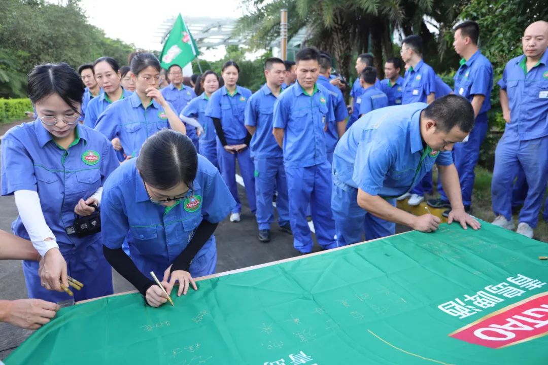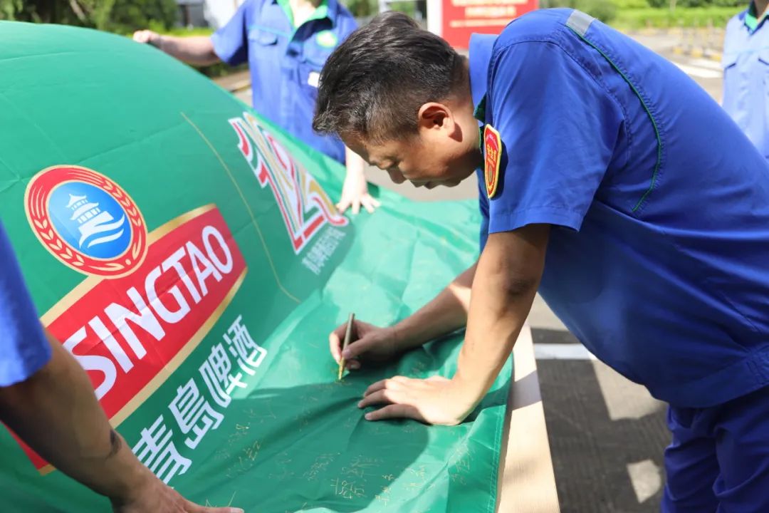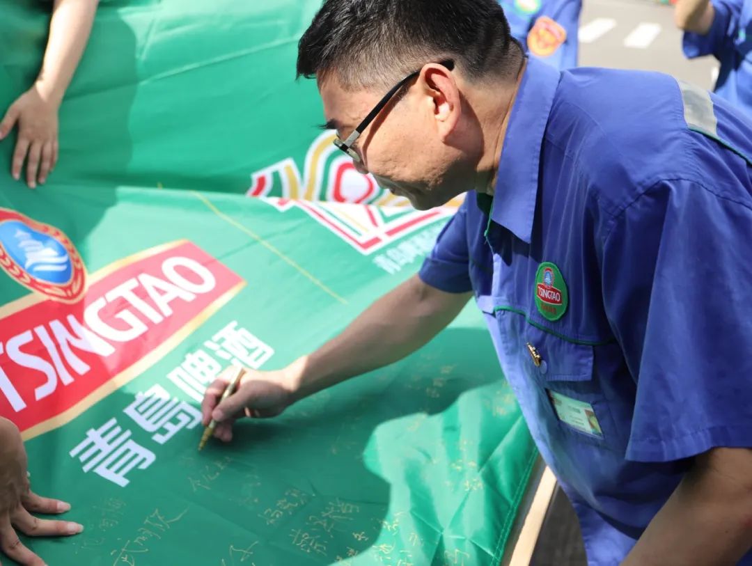本次旗帜传递仪式分为“祝福-传递-宣誓-感恩-致敬”五个部分。首先是公司管理层和员工代表纷纷在“青岛啤酒120周年纪念标识旗帜”上签名并写下对青岛啤酒百廿华诞的祝福。