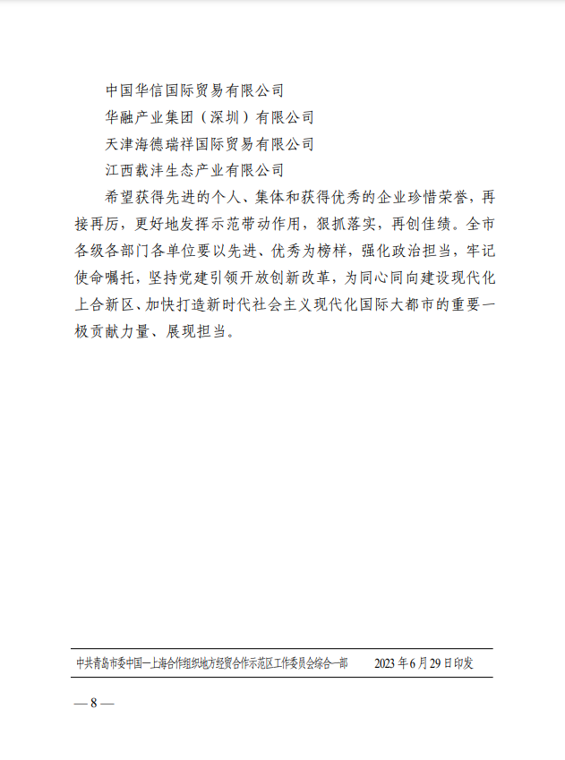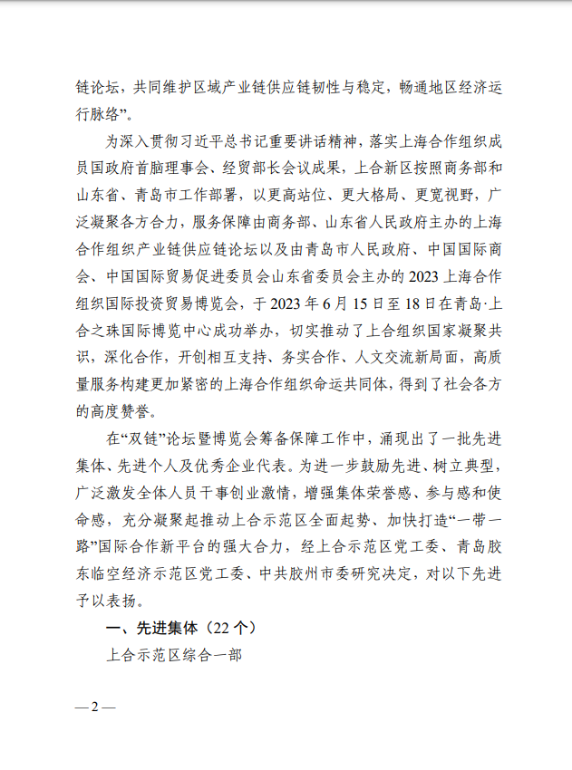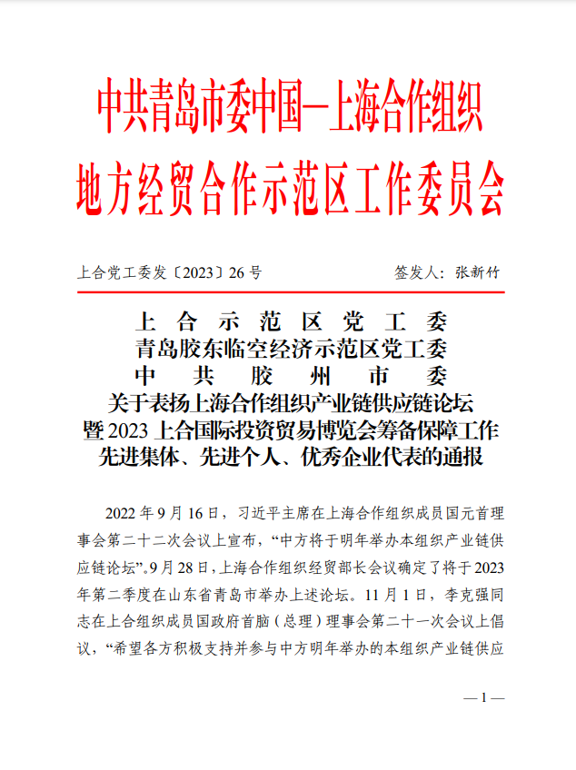 6月30日,上海合作组织产业链供应链论坛暨2023上合国际投资贸易博览会(以下简称:“双链论坛”暨上合博览会)总结表扬大会在青岛·上合之珠国际博览中心召开。总结表扬大会上,协会获得优秀企业荣誉称号。