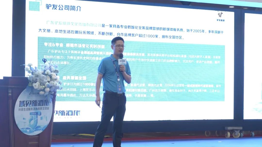 为加强酒旅企业与抖音生活服务平台的交流合作,广东驴友旅游文化传播有限公司总经理赵朵上台做出了经典案例分享与解决方案的介绍。
